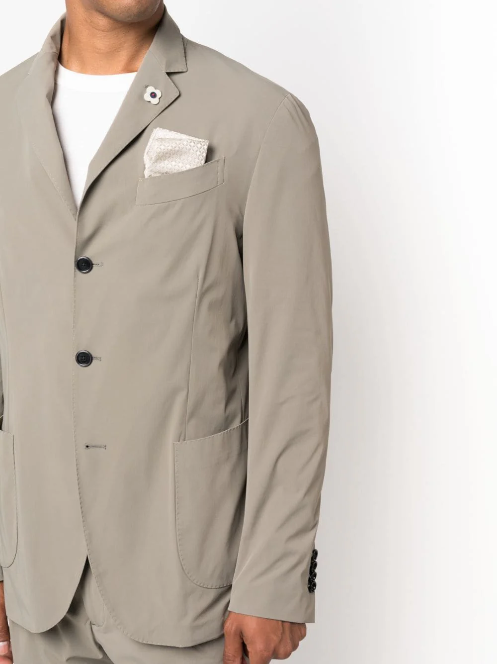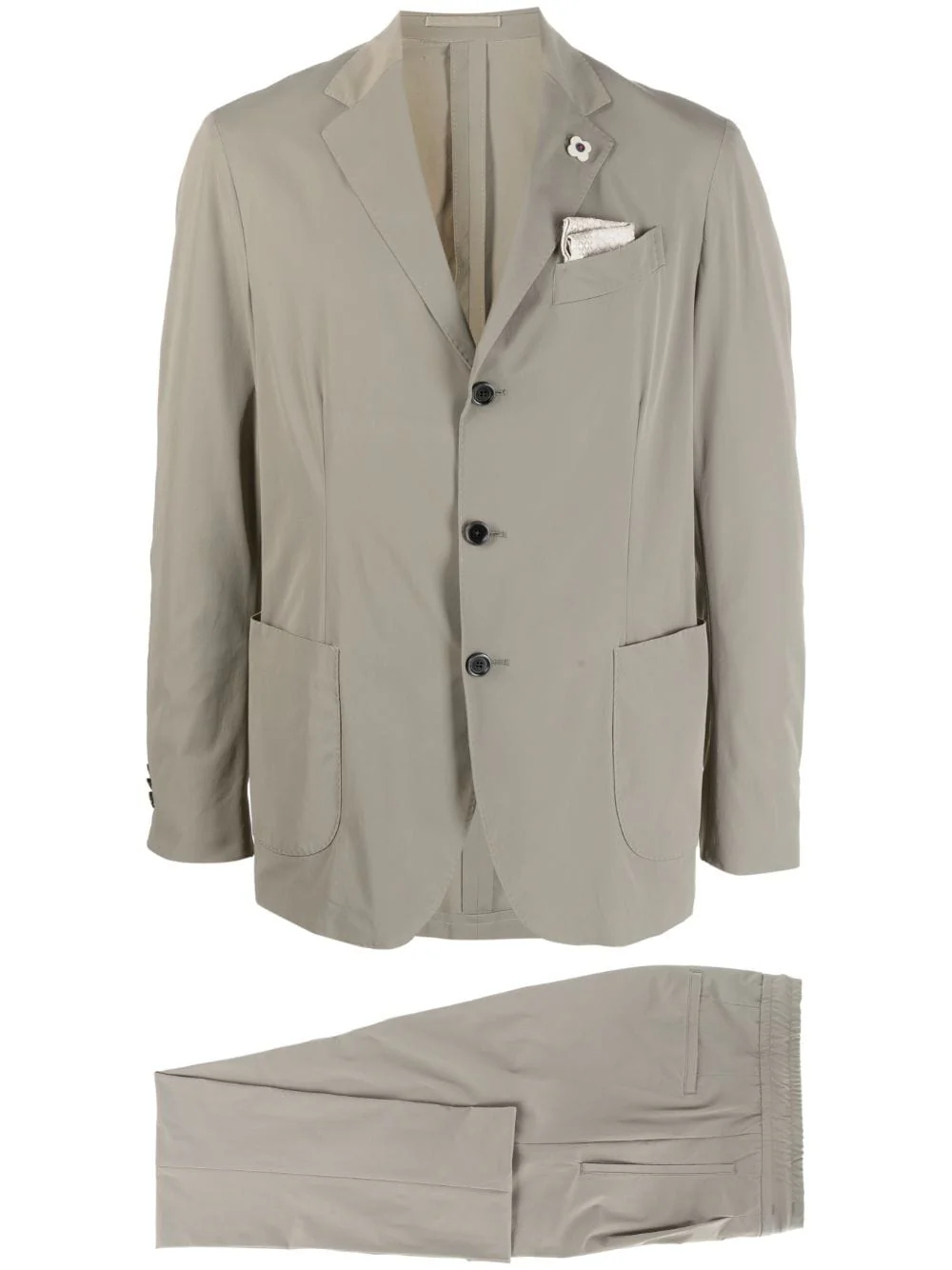 Costume LARDINI vert sauge du désert, revers crantés, fermeture à boutons avant, manches longues, poignets boutonnés, bouches d’aération arrière anglaises, poche de poitrine, deux poches latérales, fermeture avant dissimulée, ceinture à cordon élastique, mi-hauteur, jambe droite, deux poches latérales encastrées et deux poches arrières.