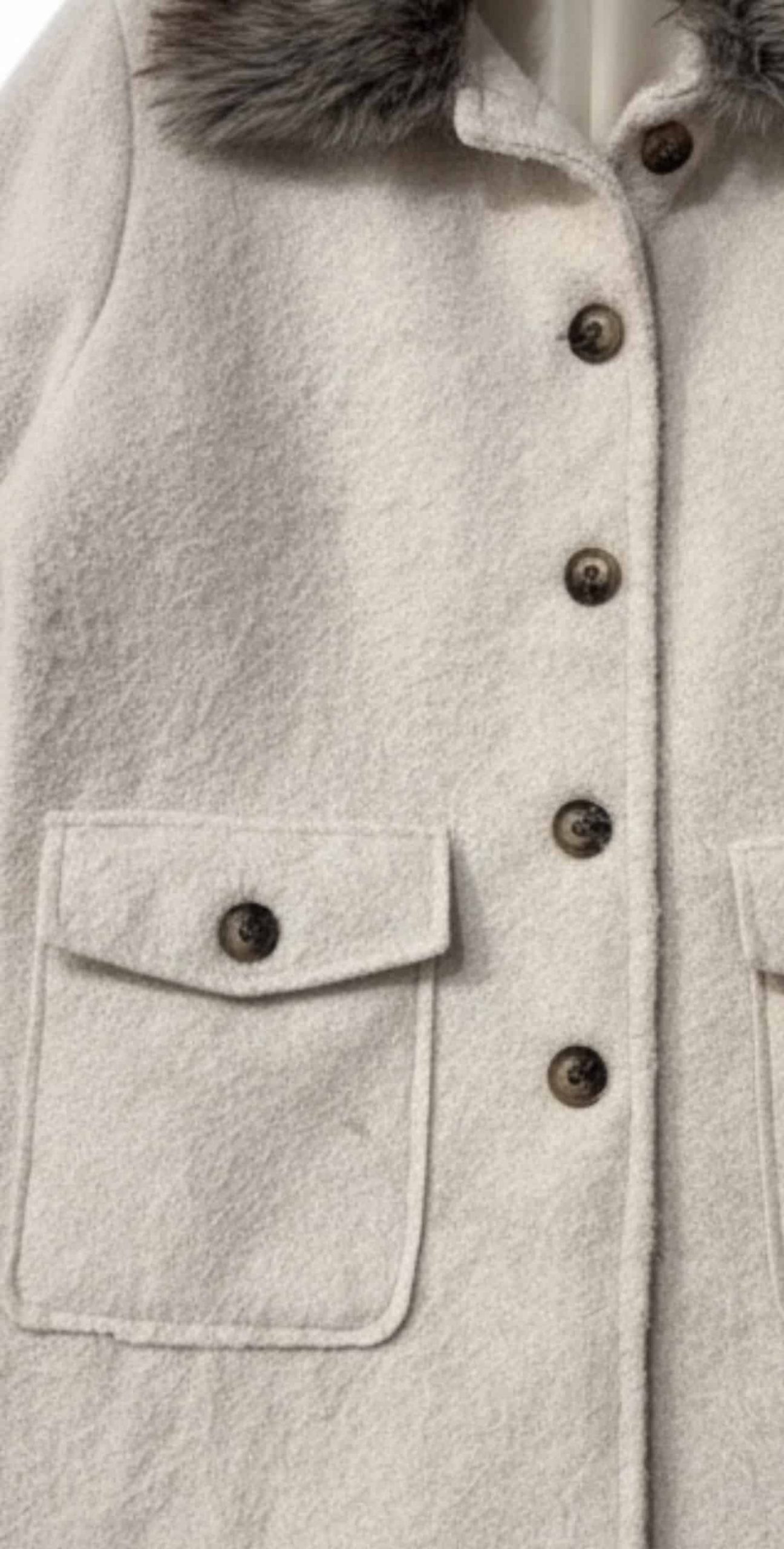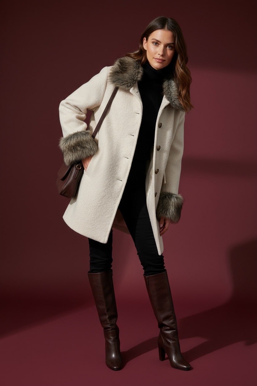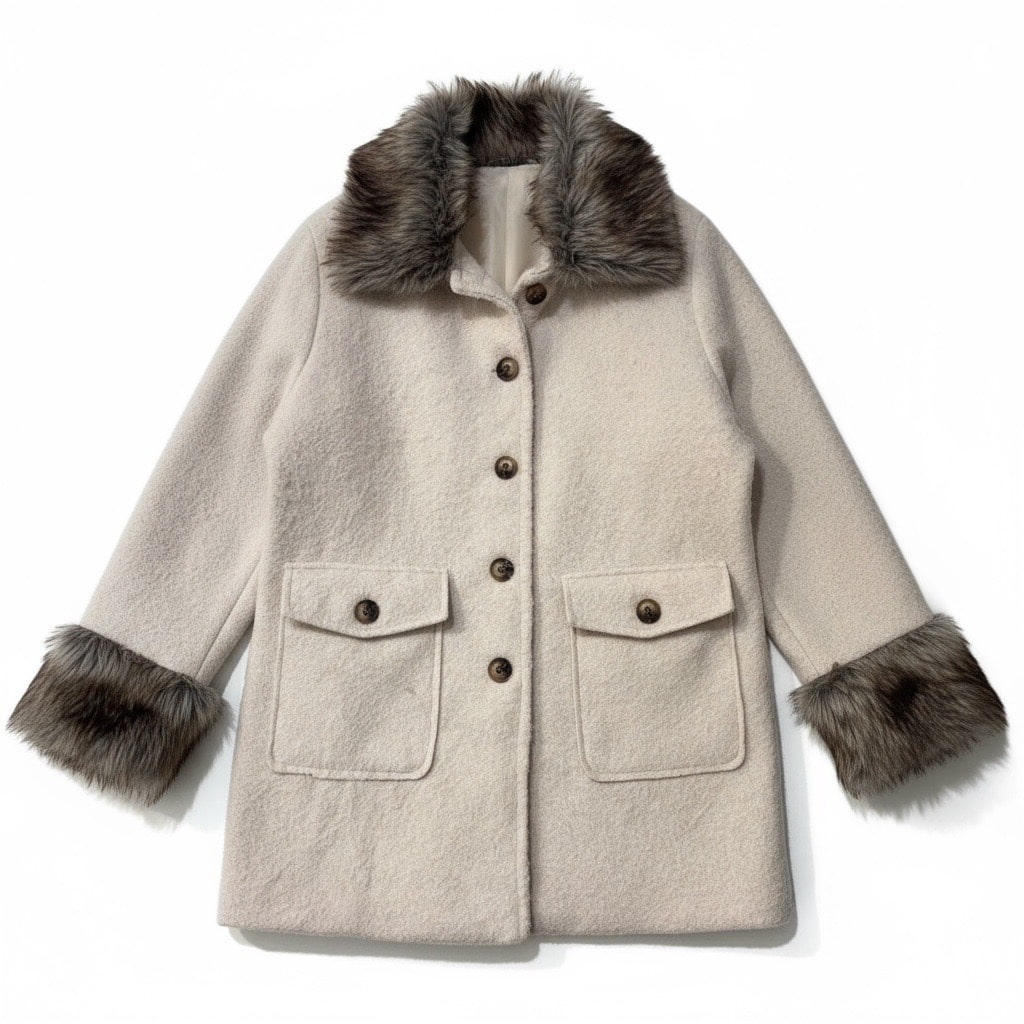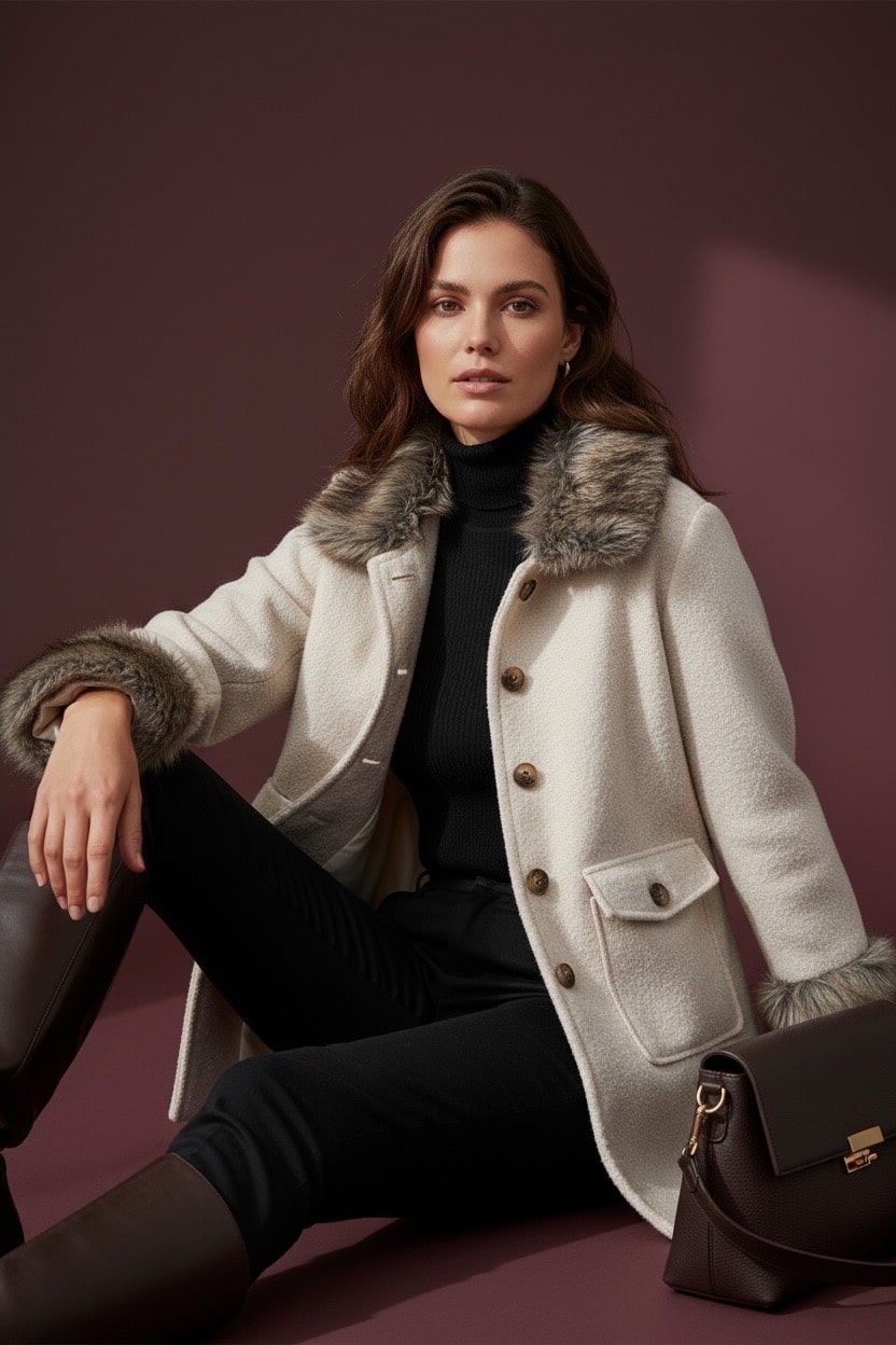 Le manteau Alaska allie chaleur et élégance avec son col et ses poignets bordés de fausse fourrure. Confectionné dans un mélange de laine et de polyester, il offre une texture douce et structurée. Sa coupe droite et ses poches à rabat en font une pièce intemporelle et raffinée pour l’hiver.