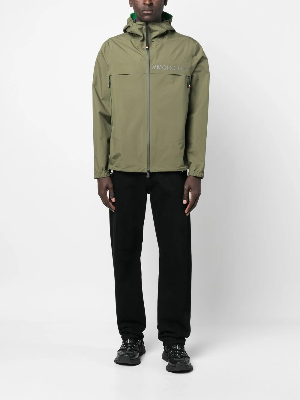 Vert asperge, logo imprimé sur le devant, col montant, capuche souple, fermeture zippée devant, manches longues, poches à fermeture zippée devant.