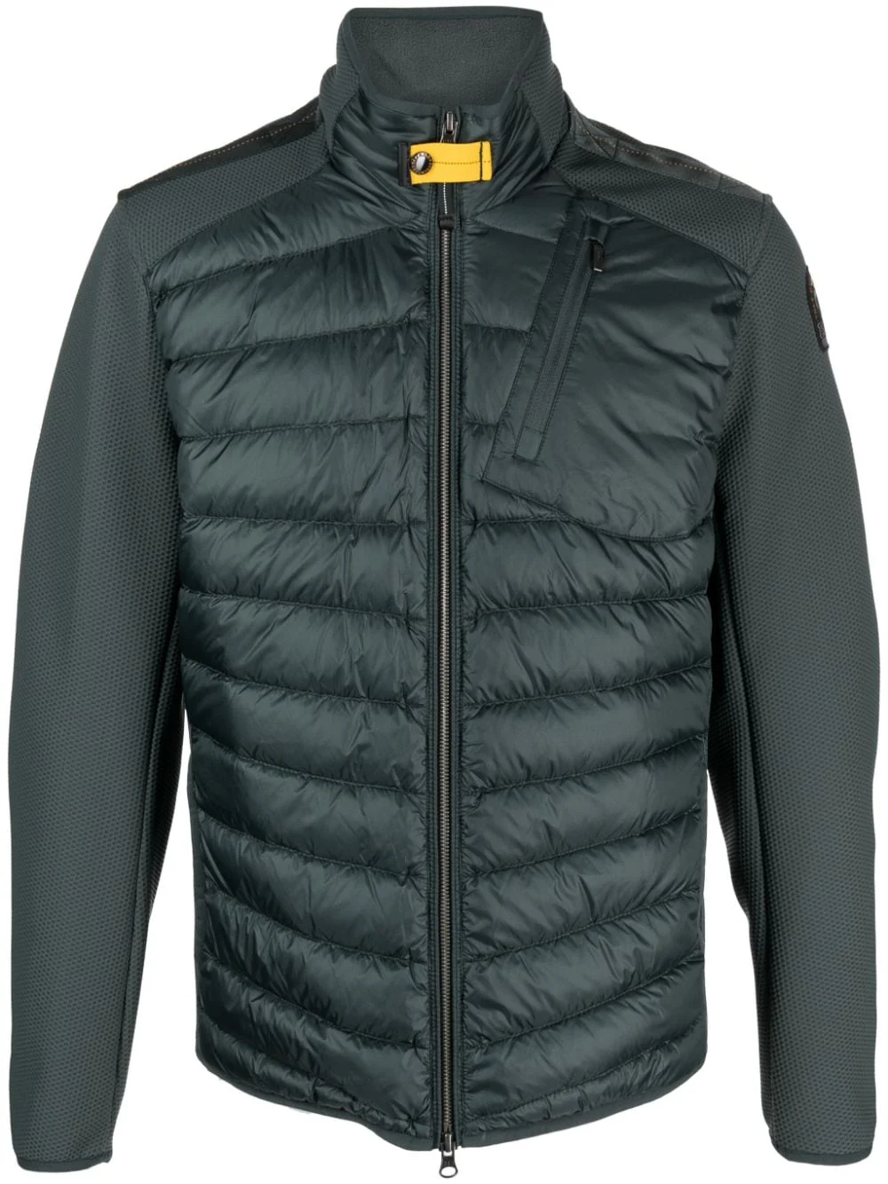Veste en polyester, réalisée en maille nid d’abeille thermosoudée avec molleton doux sur l’intérieur et présentant des insertions en taffetas semi-brillant garnies de couette 20 den avec tenue de couette et traitement déperlant. Trois poches frontales, une petite poche postérieure à escamoter, ainsi que deux poches intérieures. Fermeture à chute à double sens. Poignets, ourlet inférieur, col, poches garnies de Lycra. Aérations sous les bras. Col avec fermeture par sangle élastique jaune iconique et écusson PJS sur la manche gauche.