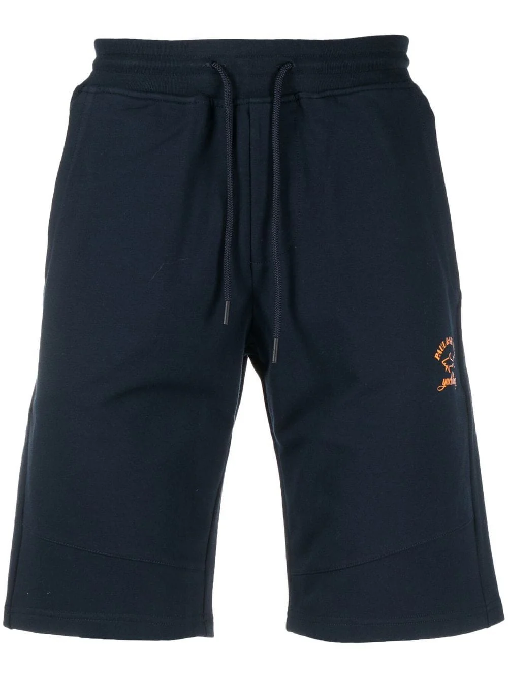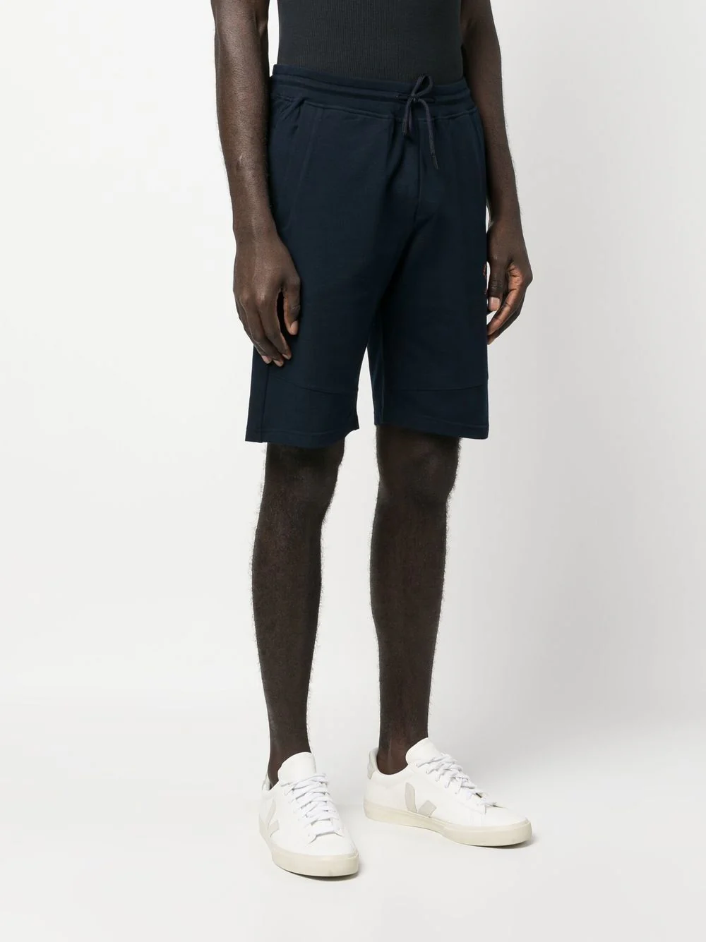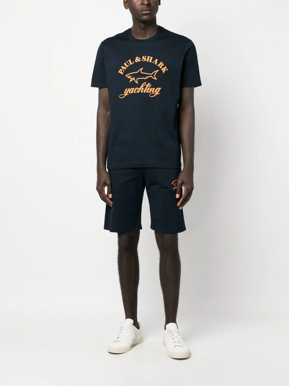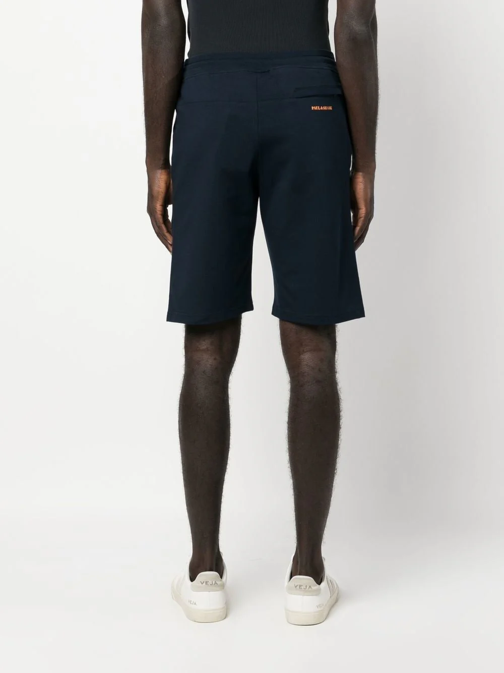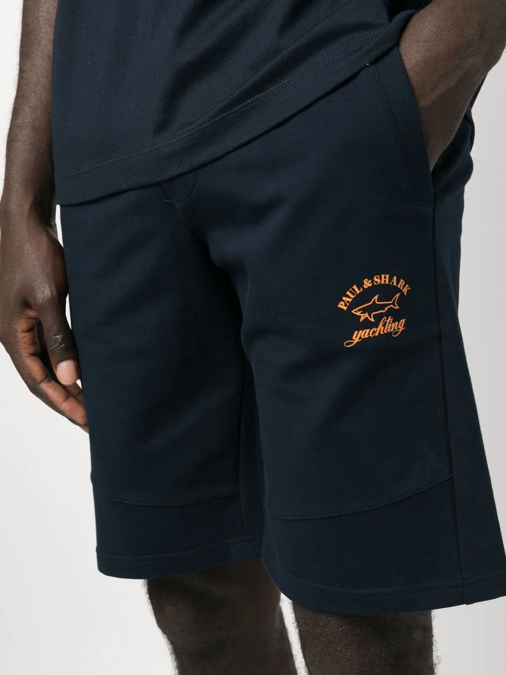 Bleu marine, coton stretch, tricot point jersey, logo imprimé sur la cuisse, taille élastique à lien de resserrage, poches latérales fendues, poche arrière passepoilée, longueur au dessus du genou.