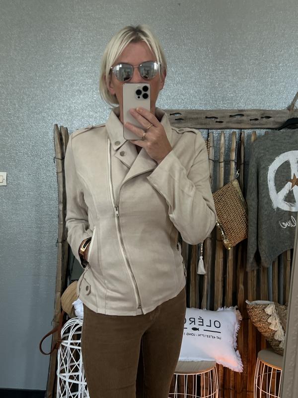 Perfecto suédine 100% polyester je porte TS pas d’échange ni retour sur ce produit je mesure 1,60m 50kgs TS36/38 TM38/40 TL40/42
