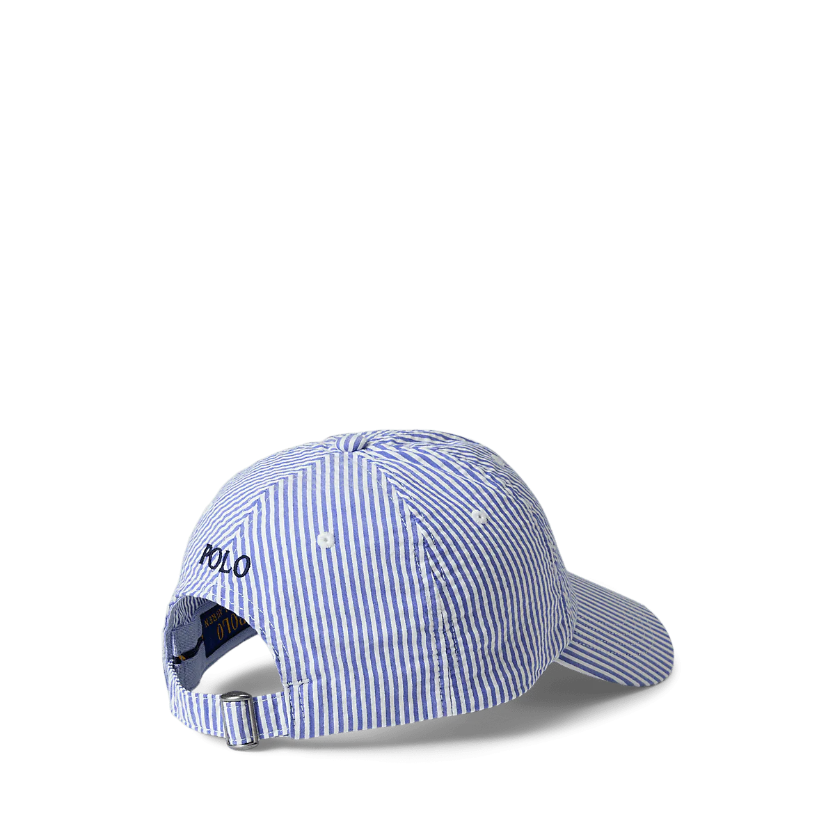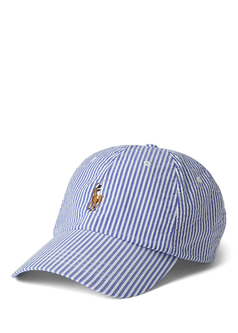 Cette casquette de baseball classique associe un seersucker rayé aéré au poney multicolore distinctif brodé de Ralph Lauren.
