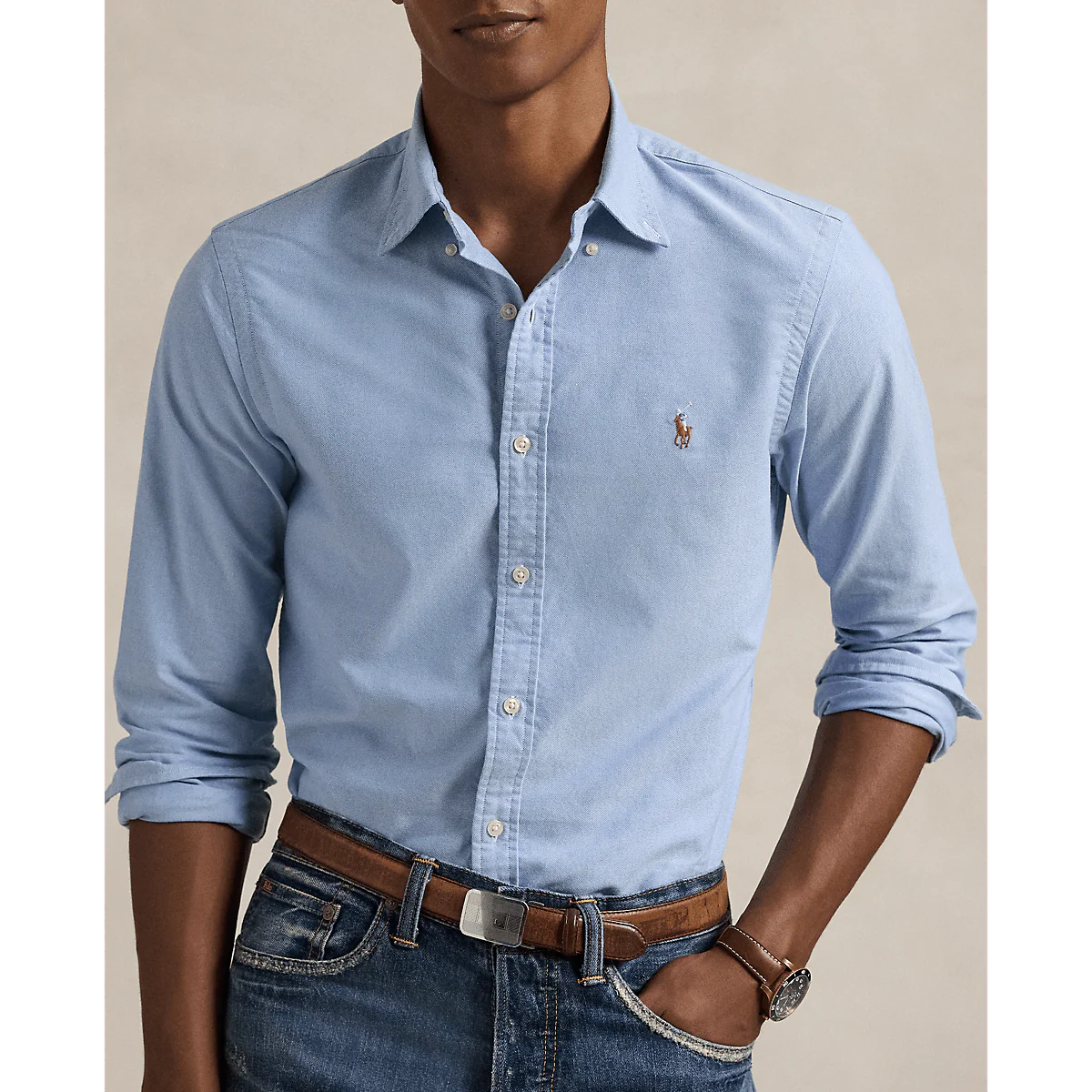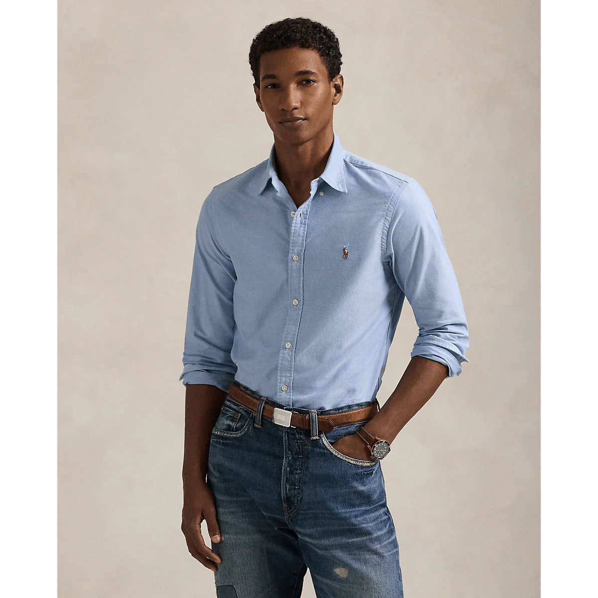 Cette chemise Oxford, à l’origine de la marque Ralph Lauren, est aujourd’hui devenue un modèle incontournable du look Polo. M. Lauren ne cesse de décliner sa chemise emblématique, dont cette version cintrée ornée de notre poney distinctif.