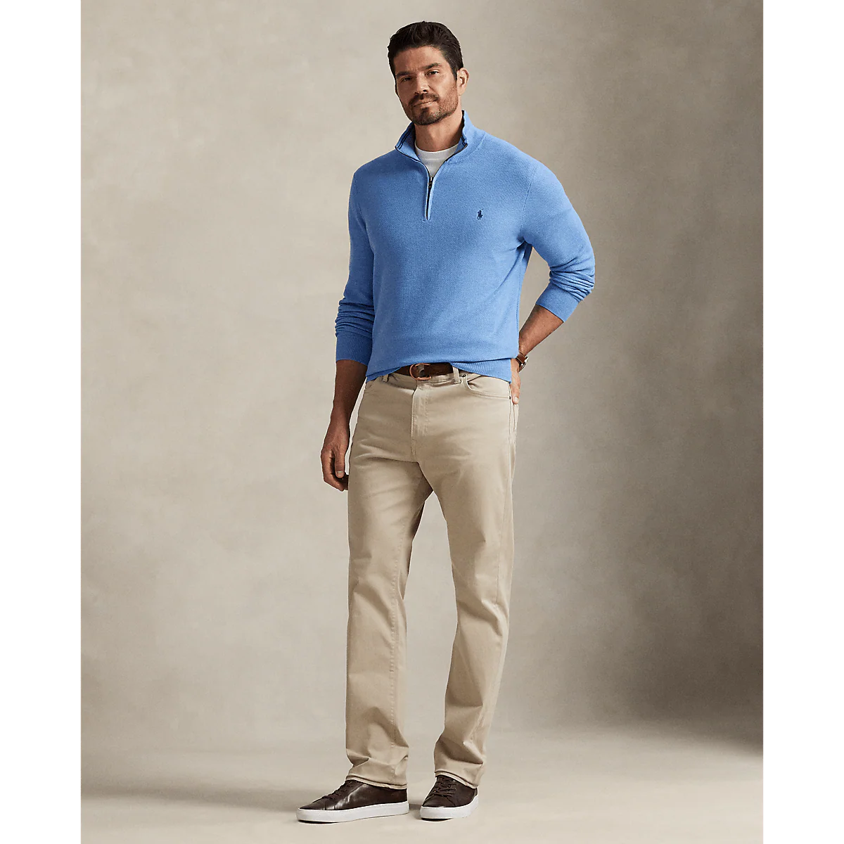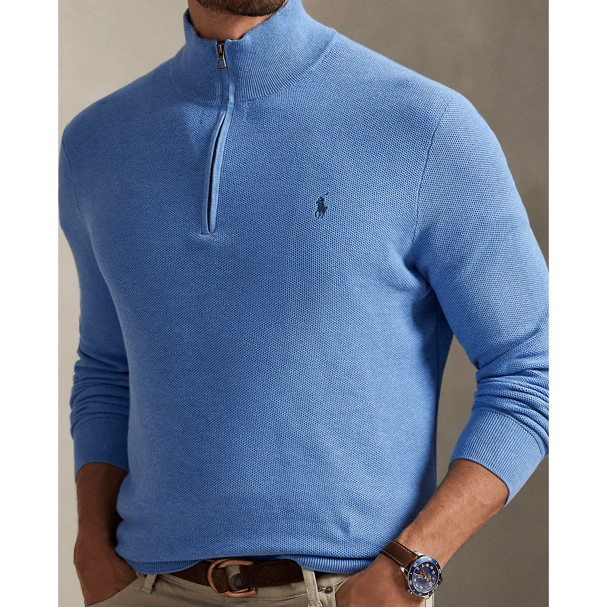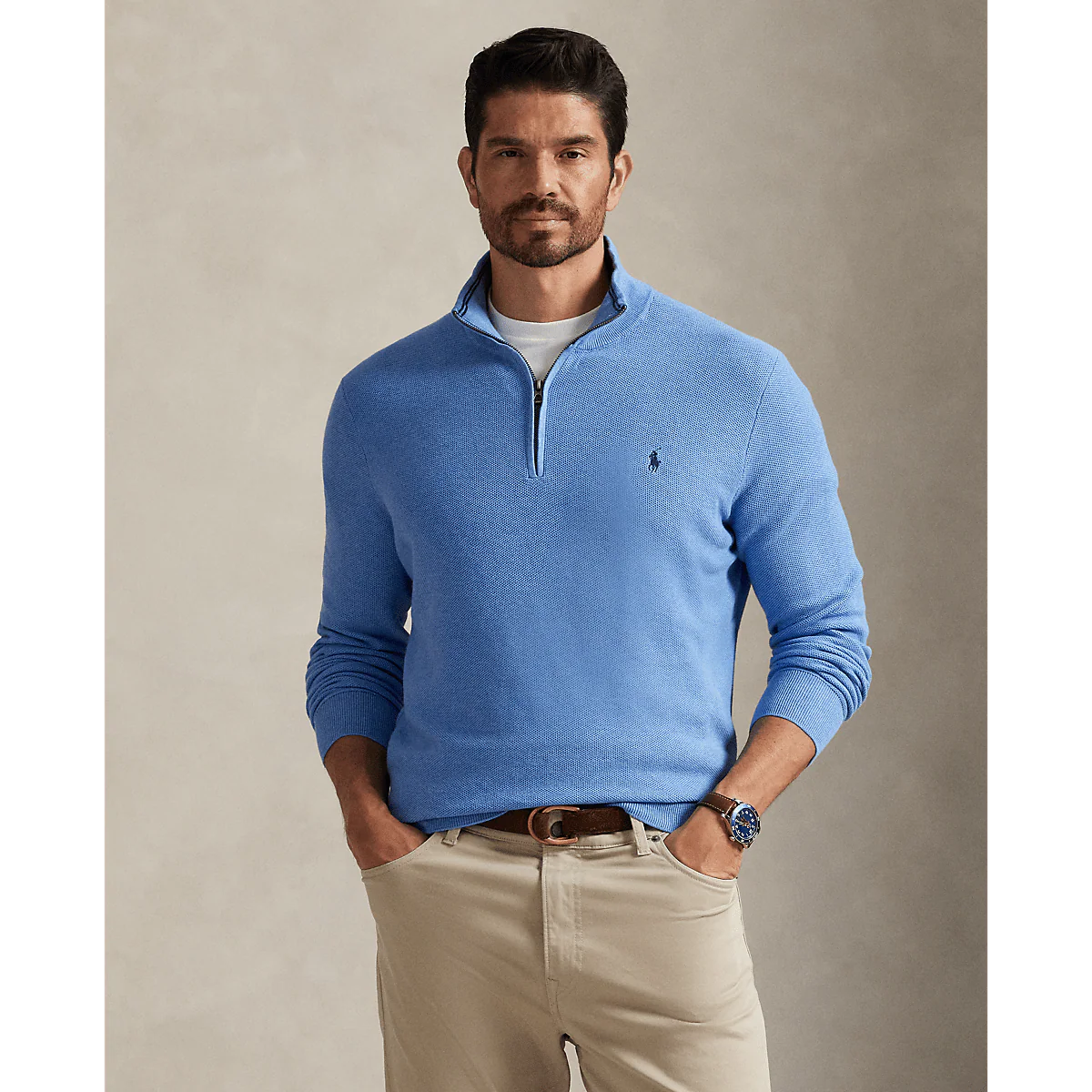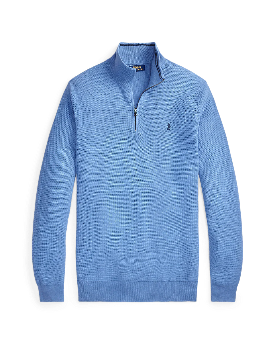 POLO RALPH LAUREN – Pull demi-zippé en coton piqué Bleu royal tendre chiné
