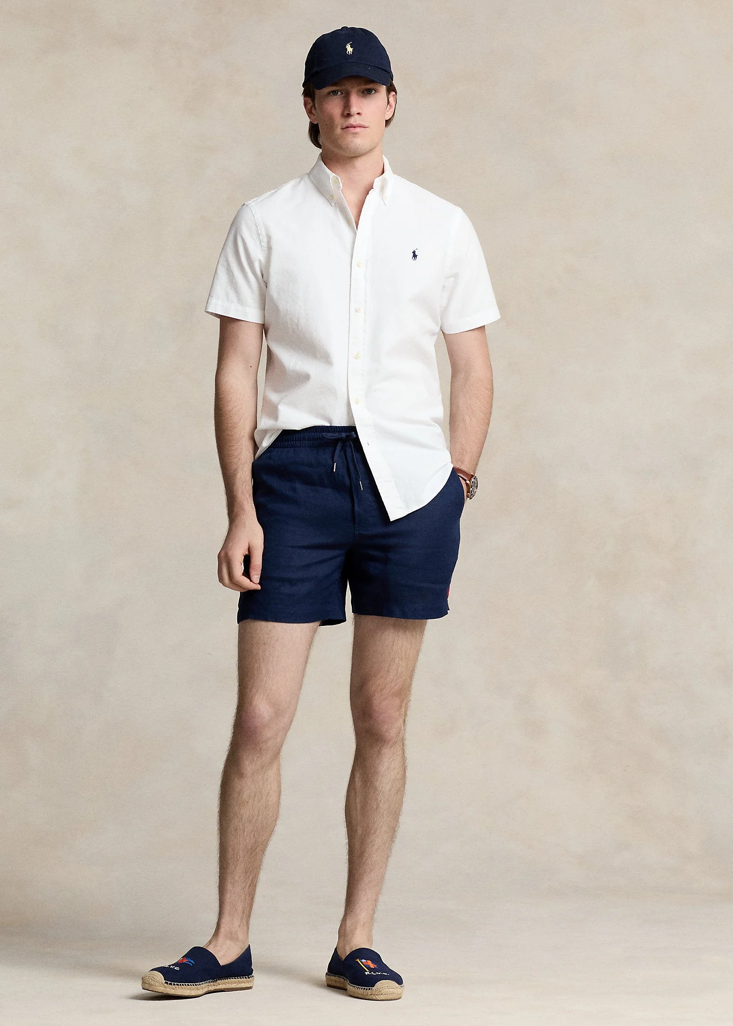 Ce short à l’entrejambe de 15,2 cm provient tout droit de nos archives. Nous l’avons revisité en le dotant d’une taille confortable à cordon de serrage. Ce modèle en lin léger est brodé de notre poney distinctif.