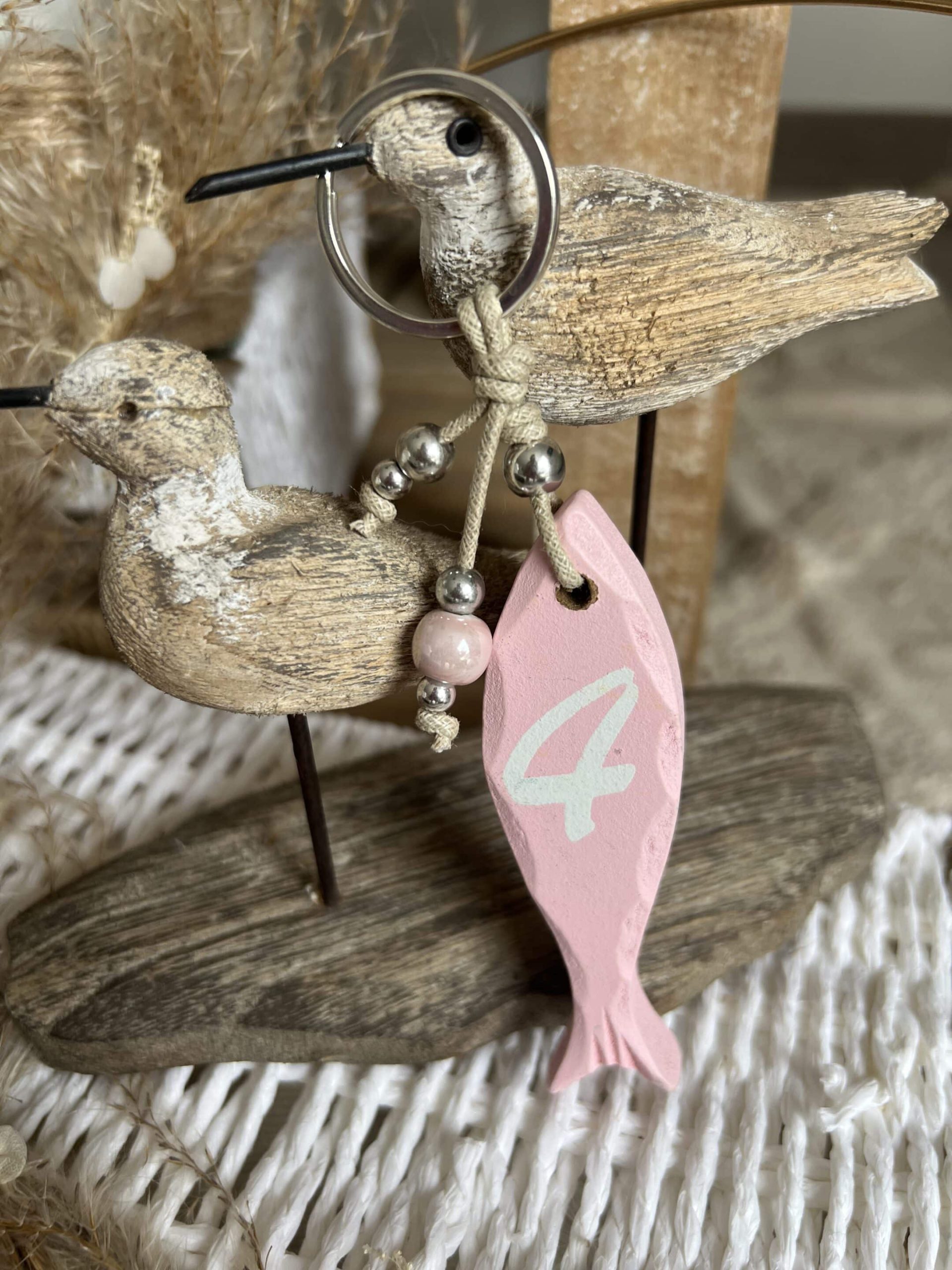 Porte clé poisson bois perle céramique perles métal argenté sans nickel