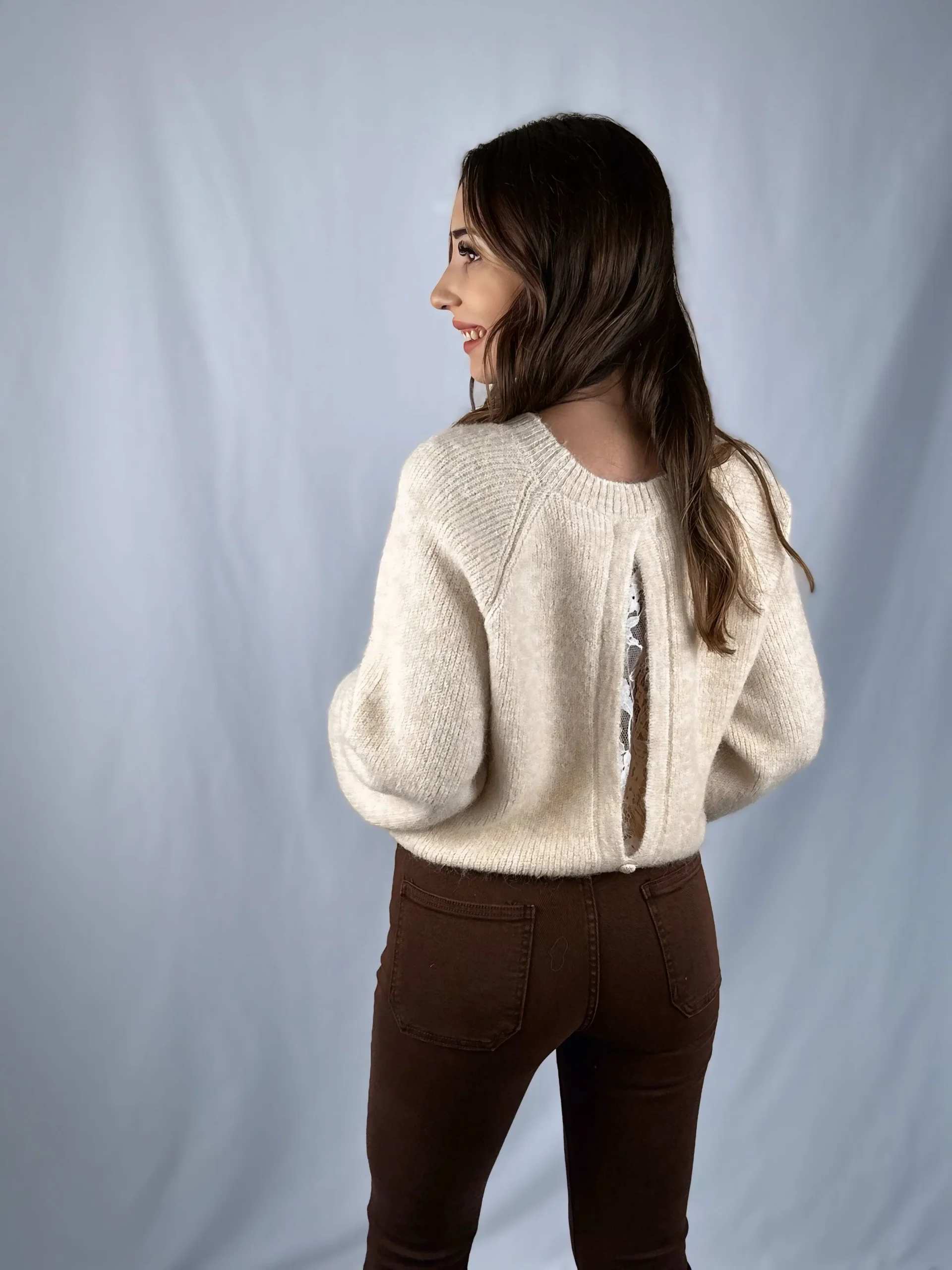 Ce pull avec sa dentelle au dos, complètera vos looks aussi bien avec un pantalon qu’avec une jupe