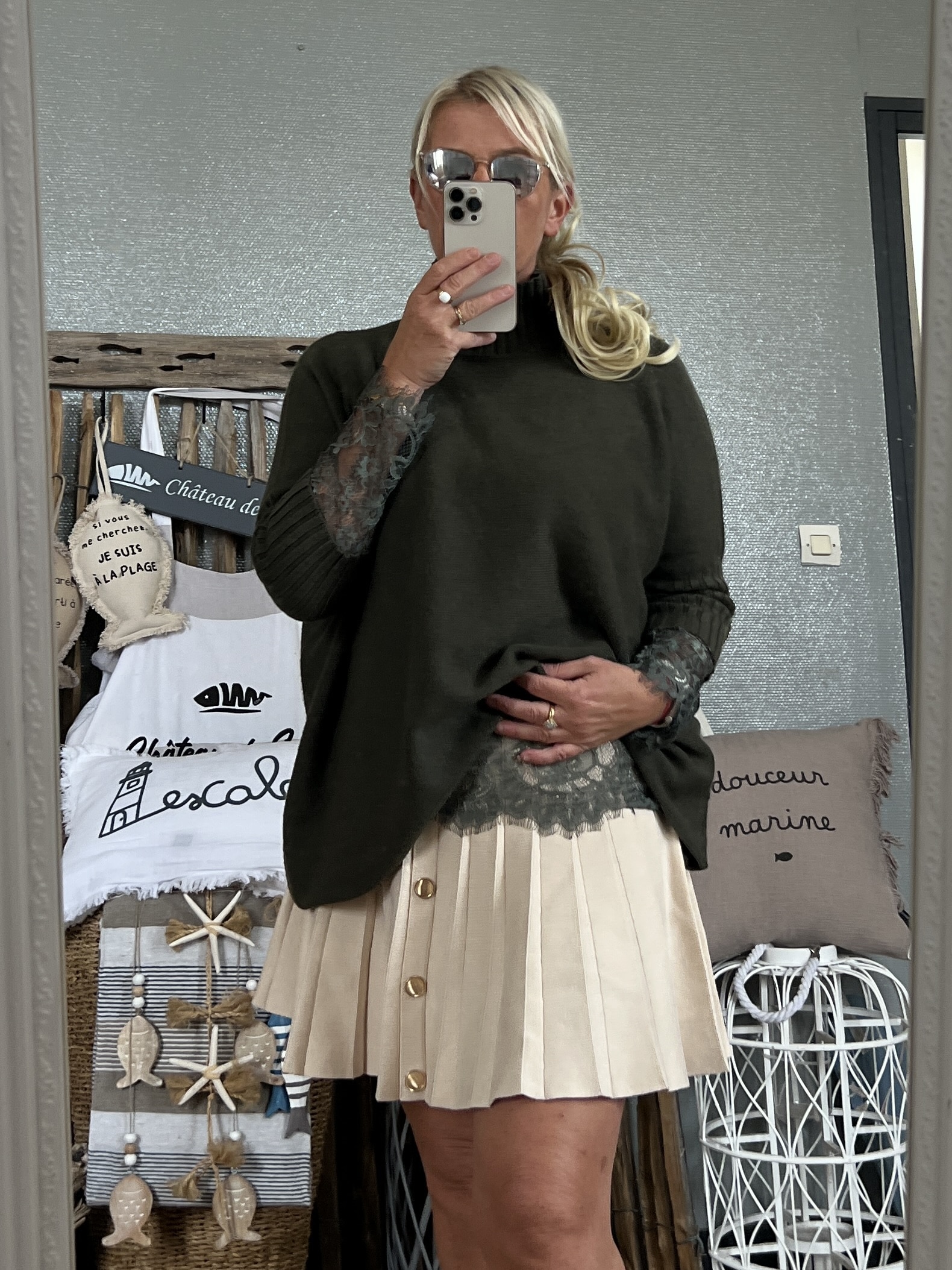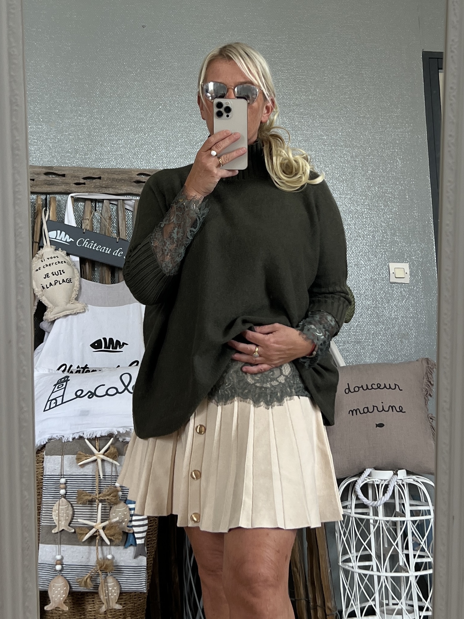 Pull taille 36/44 manches 3/4 50% Viscose 28% Nylon 22% Polyester vol cheminé Le top dentelle est vendu séparément