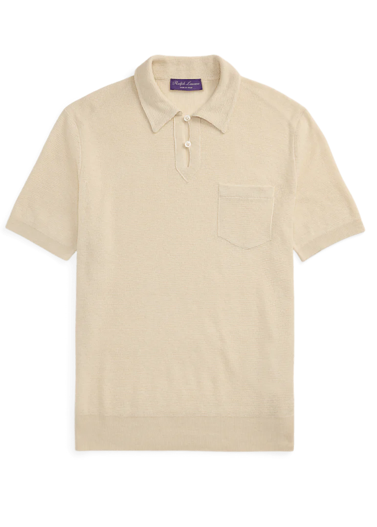 PURPLE LABEL – RALPH LAUREN – Pull texturé col polo soie et lin Beige