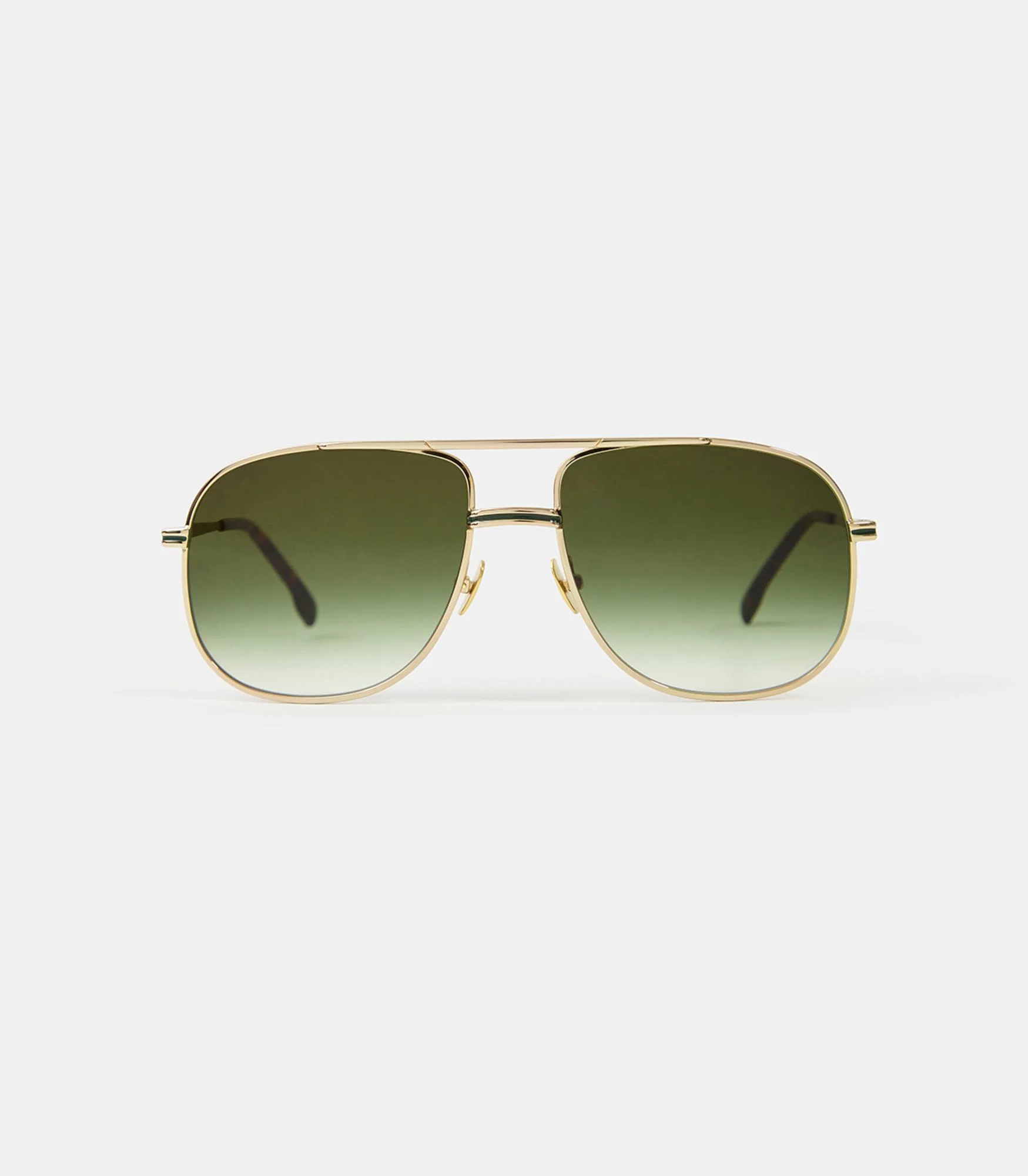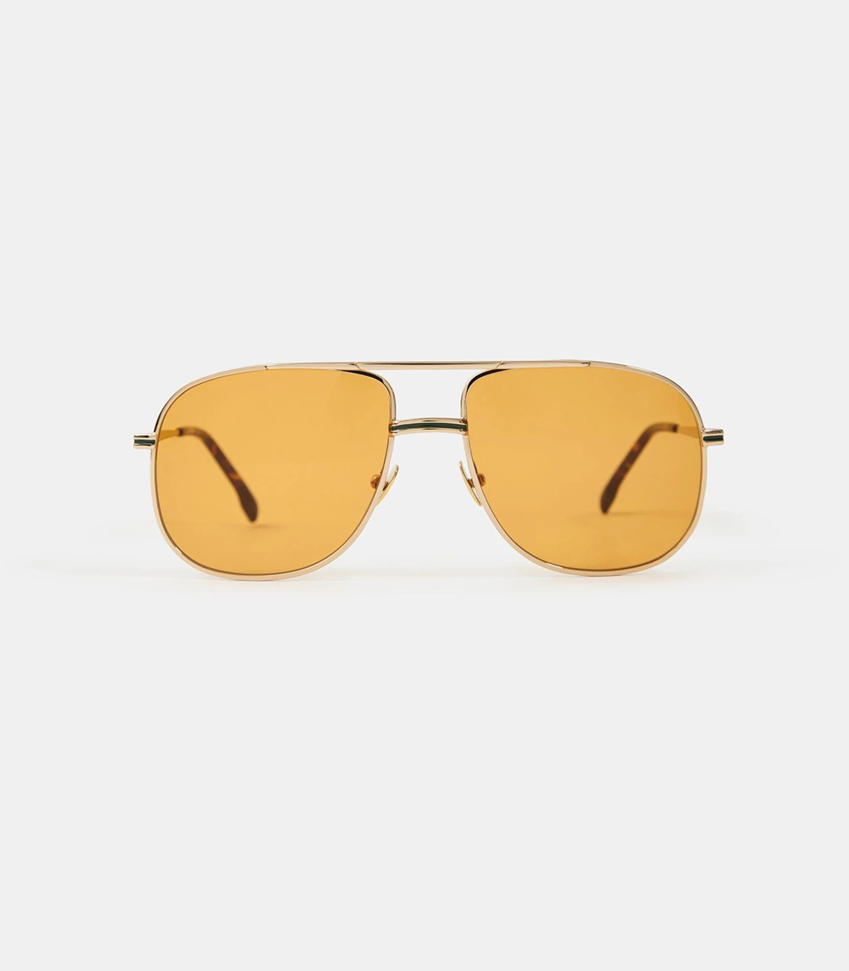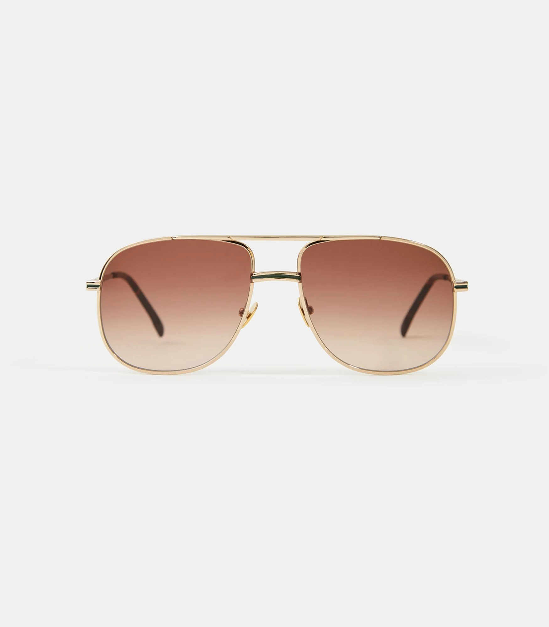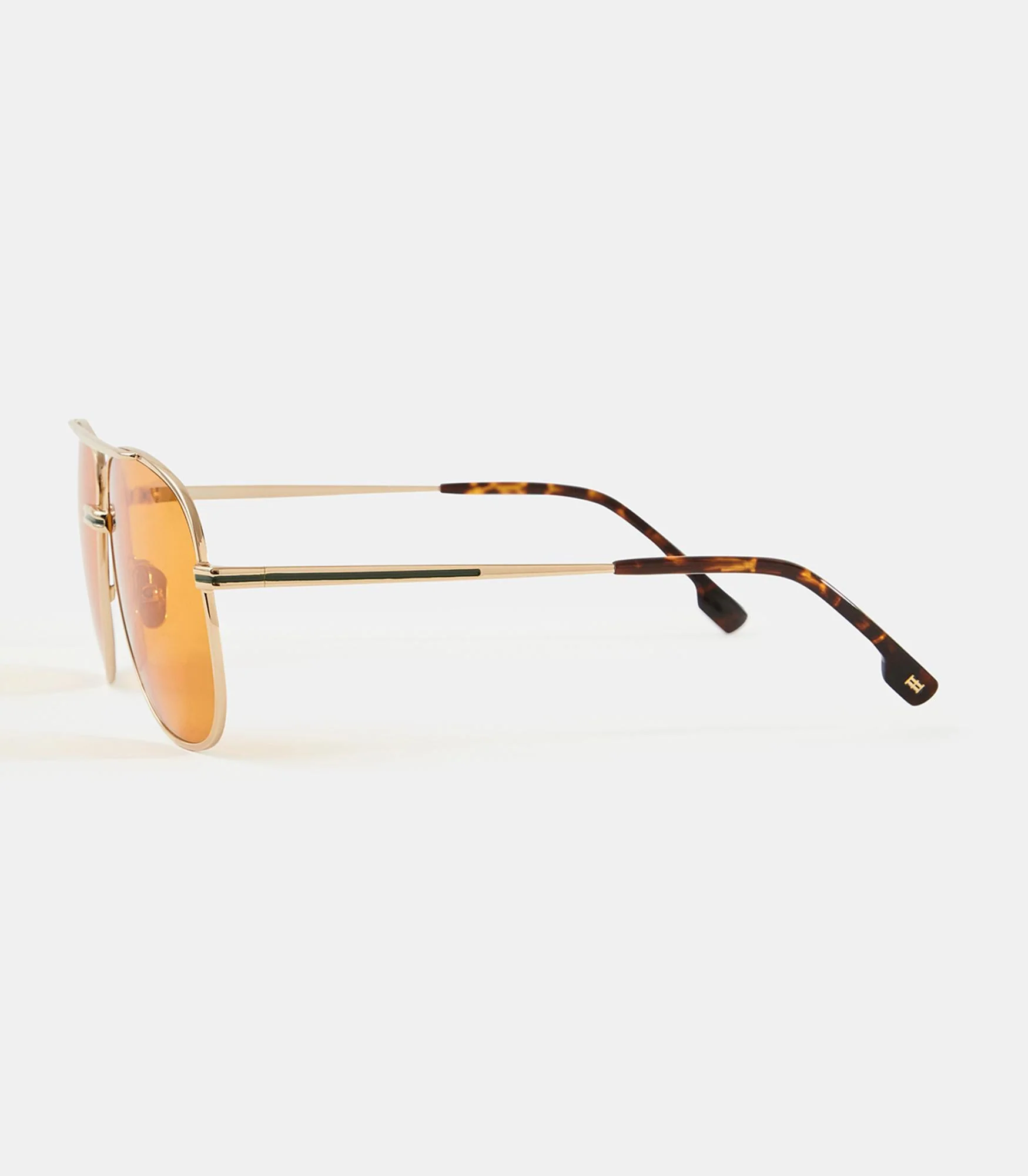 Monture en métal style pilote 80’s. Décor motif « chevrons » sur l’ensemble de la monture. Détails vert incrustés dans les branches. Embout en acétate.