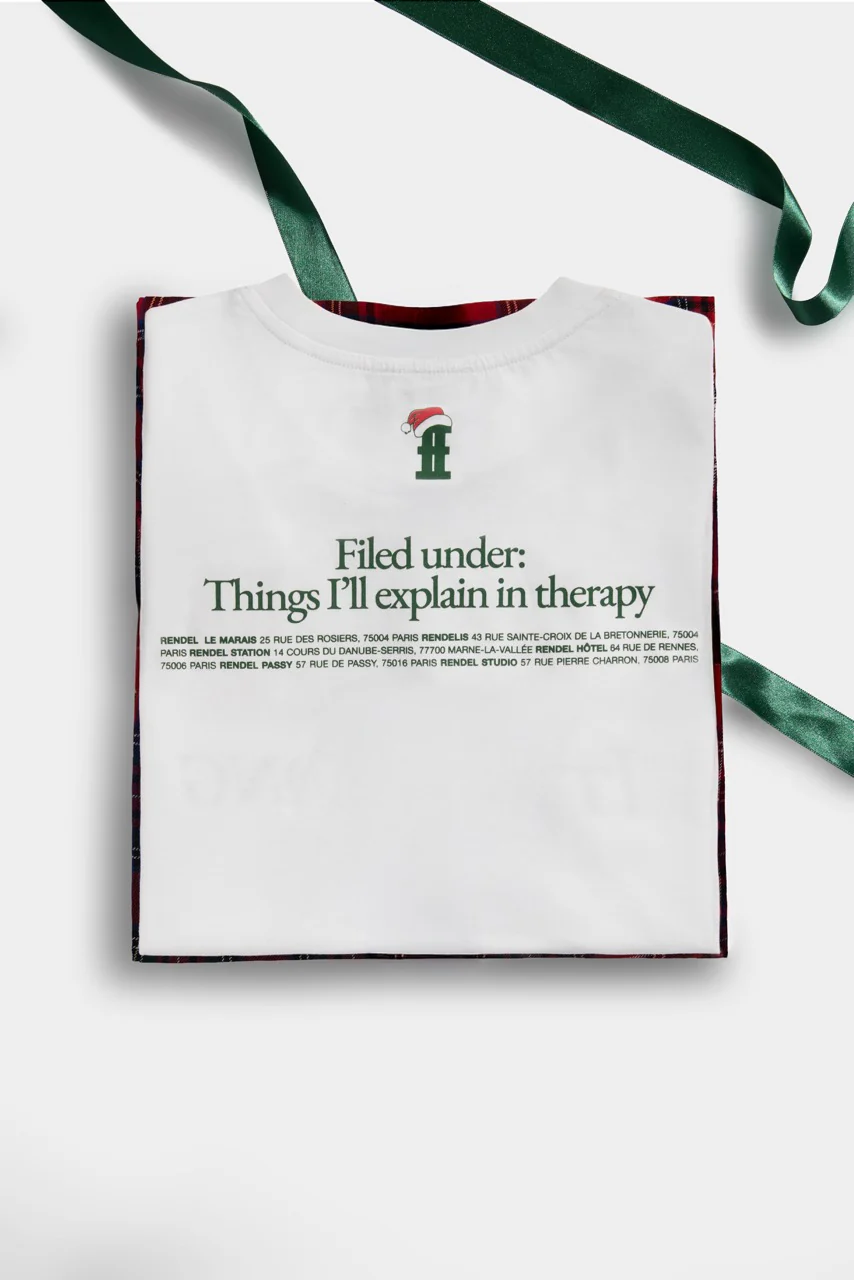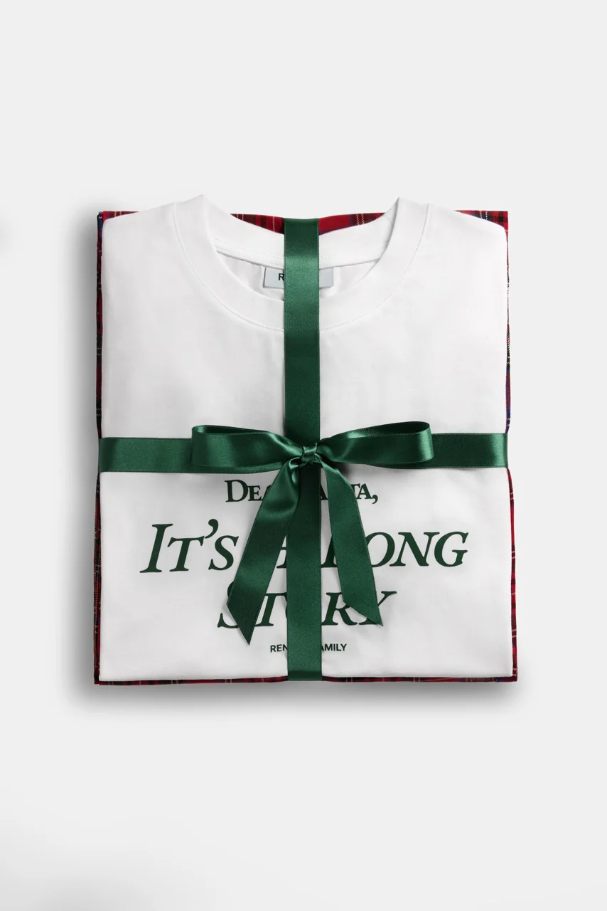 Ensemble de pyjama comprenant un t-shirt blanc imprimé, ainsi qu’un bas large en tartan orné d’un pictogramme brodé sur le haut de la jambe. 100% cotton.