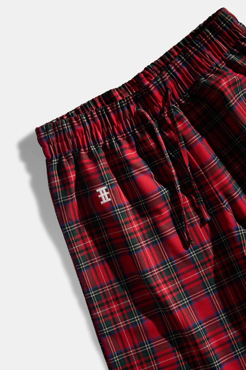 Ensemble de pyjama comprenant un t-shirt blanc imprimé, ainsi qu’un bas large en tartan orné d’un pictogramme brodé sur le haut de la jambe.