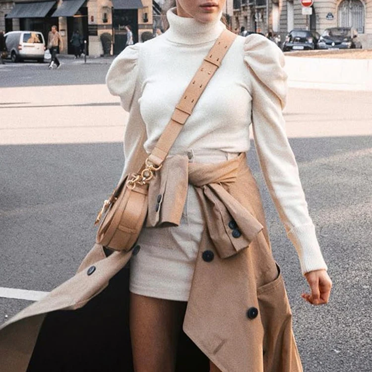 Les épaules, qui font toute la perfection et l’originalité de cette Robe Col Roulé, sont bouffantes sur leur apogée, et le reste des manches s’amincit pour longer vos bras et arriver toute juste sur vos poignet.