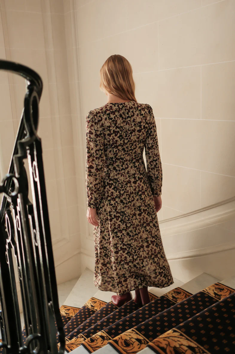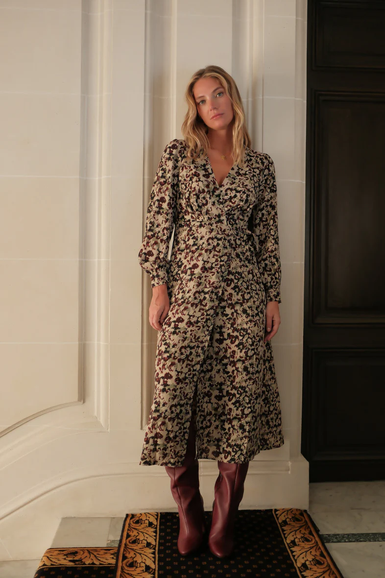 Robe longue portefeuille, doublée, imprimé à tâches, bouton sur les poignets
