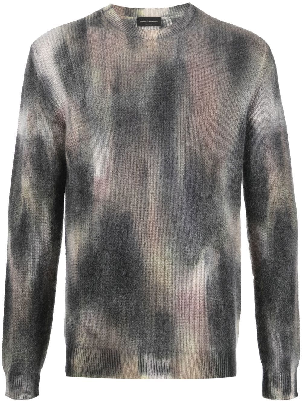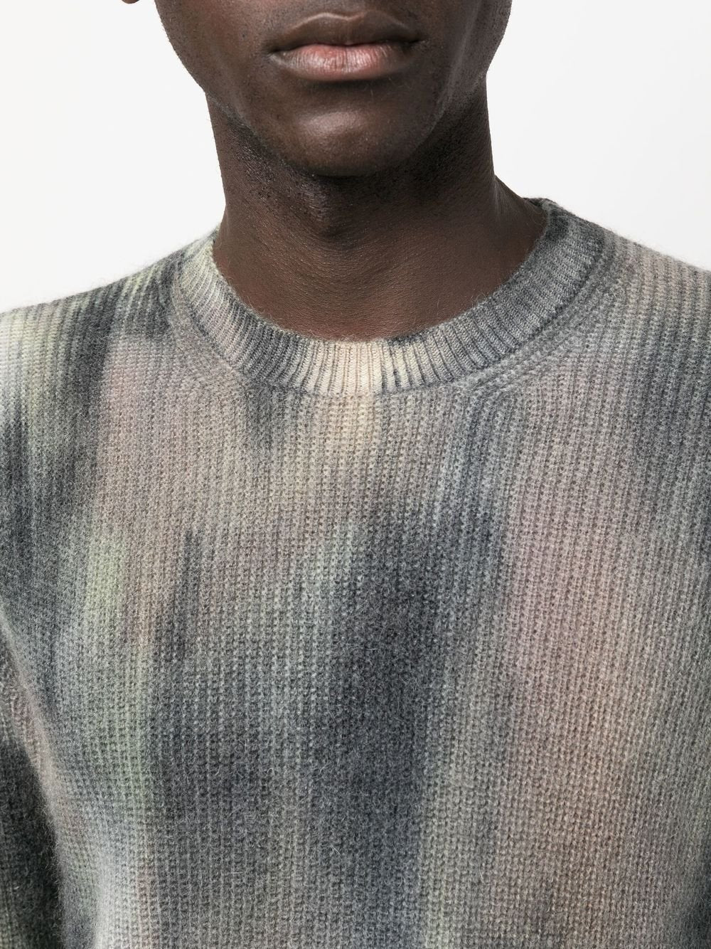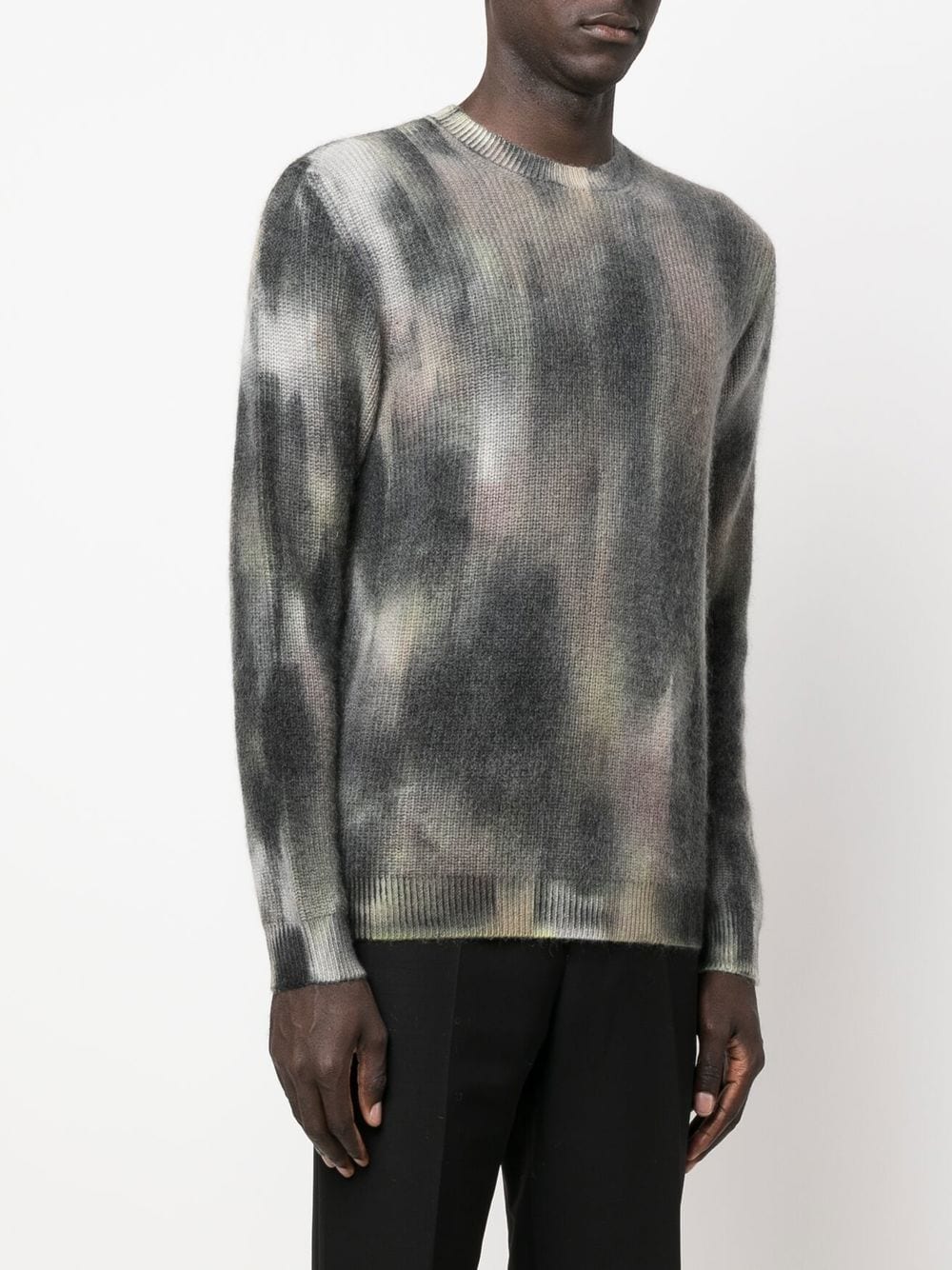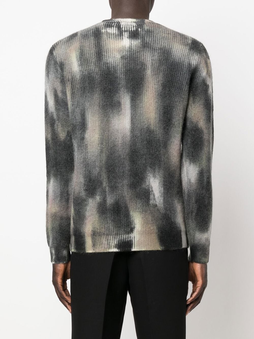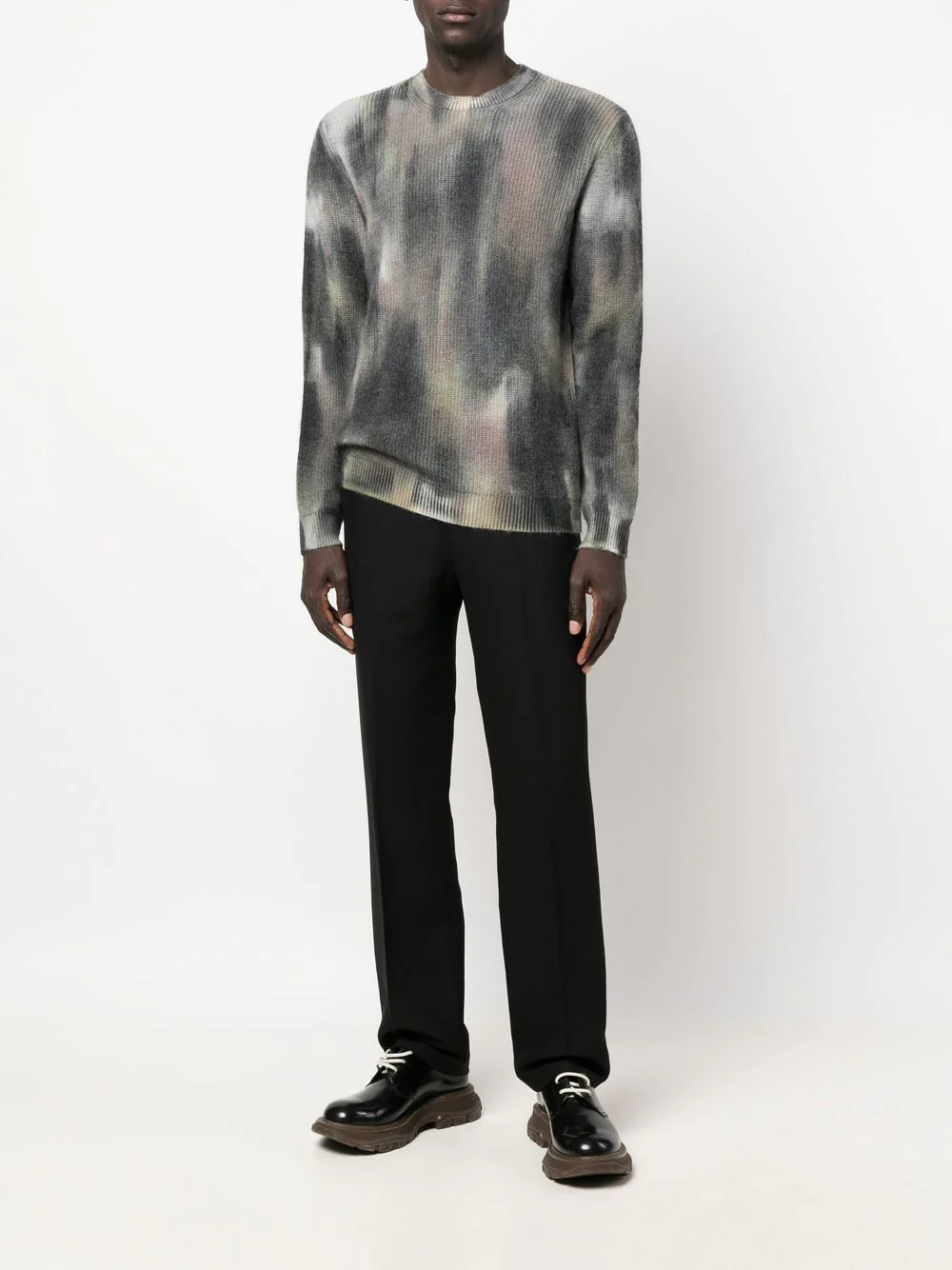 Noir/gris, mérinos mélangé, maille nervurée, imprimé tie dye, effet usé, encolure ras du cou, manches longues, ourlet droit.