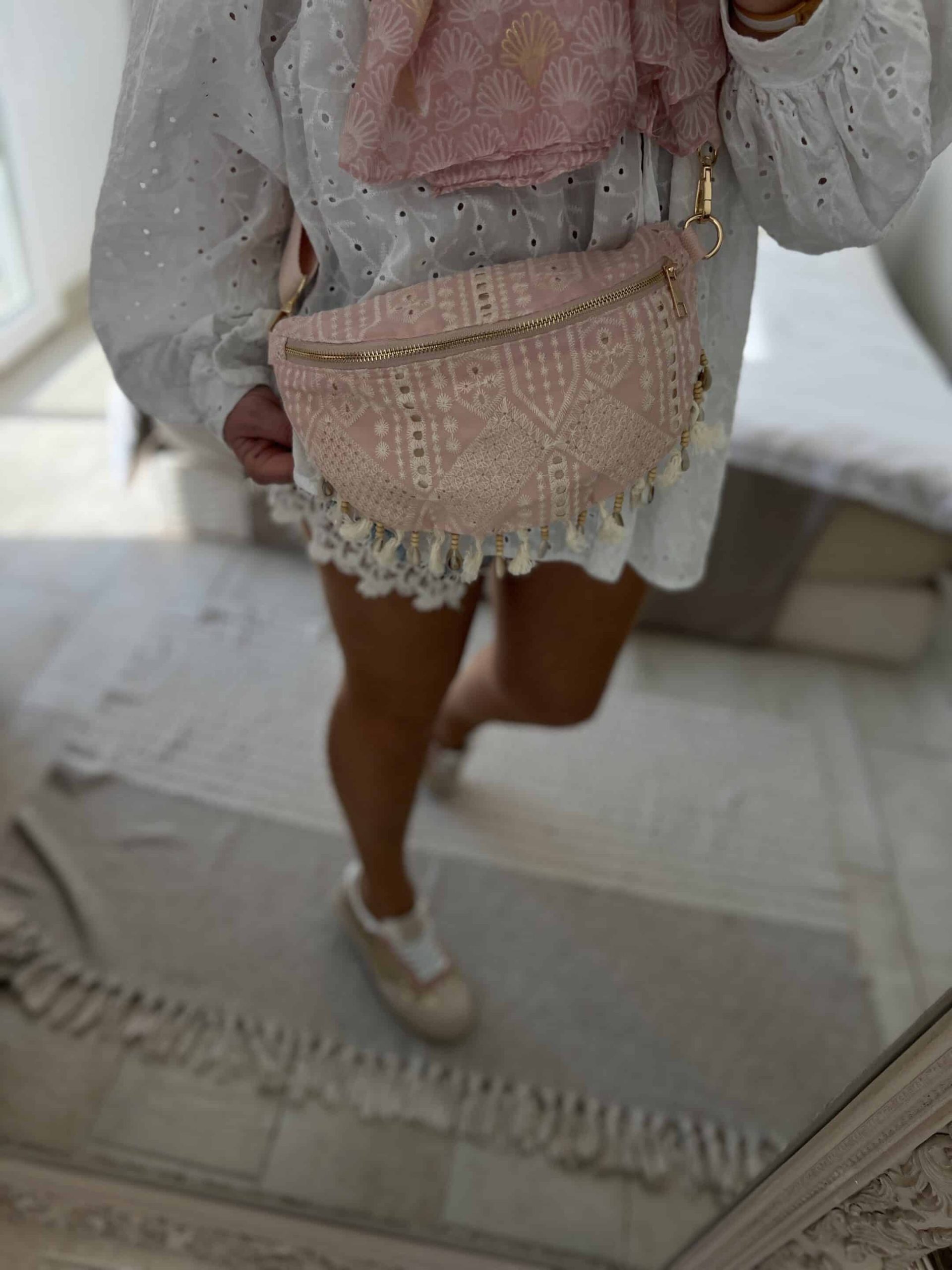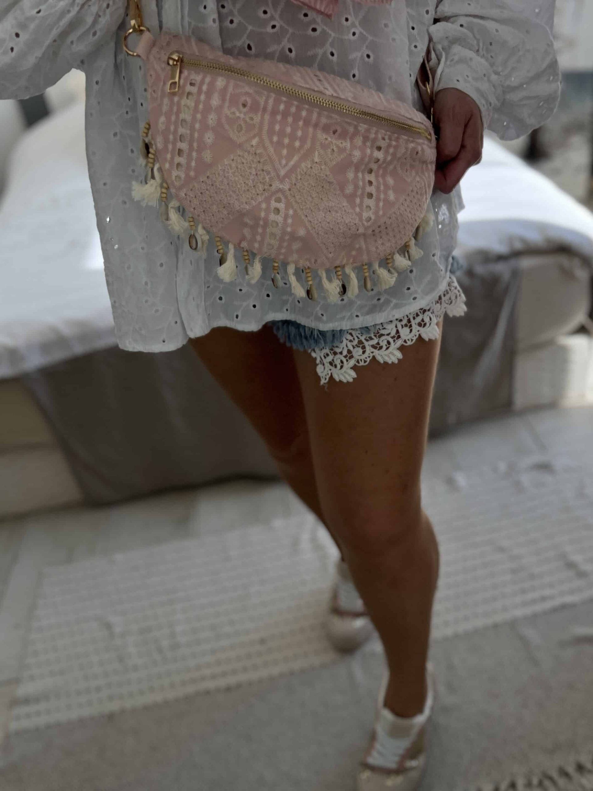 Léger et tendance, ce sac banane en coton est décoré de coquillages pour une touche estivale et bohème. Pratique et stylé, il complète parfaitement vos looks d’été ou de festival. Dimensions : 28*17 cm