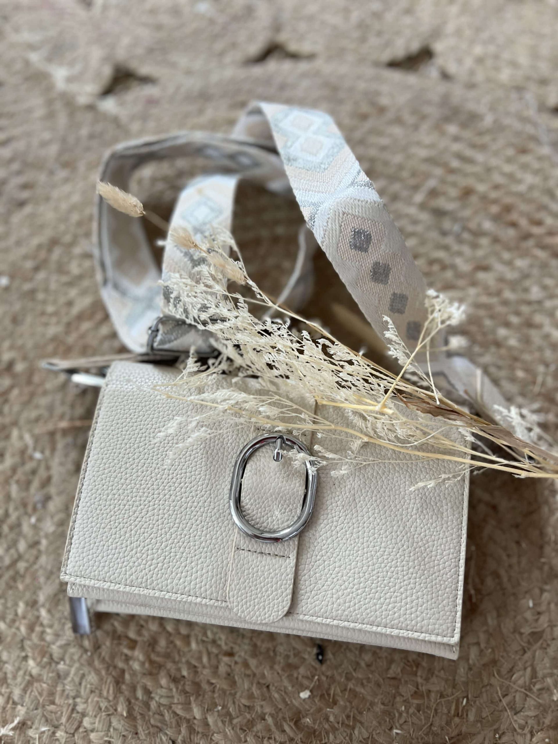 Sac bandoulière avec boucle décorative. Ce sac comprend une fermeture à clip aimenté, une bandoulière amovible ainsi que 3 compartiments dont une partie portefeuille. 100 % synthétique. Dimension de 20cm x 6cm x 12cm.