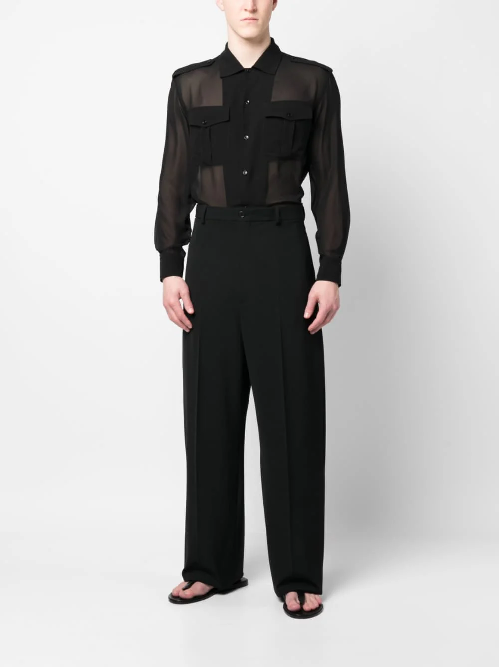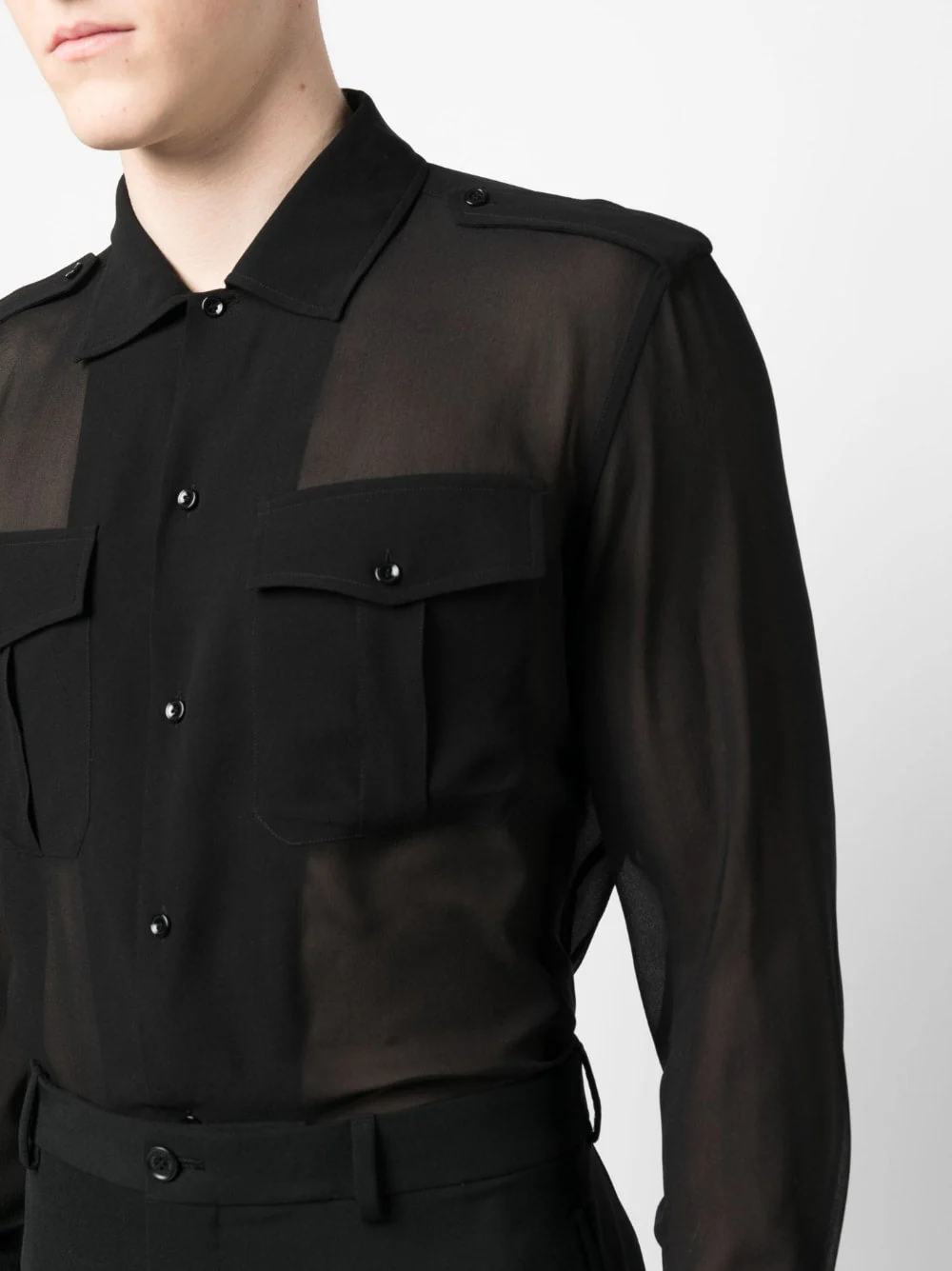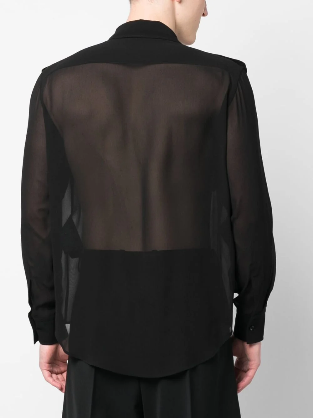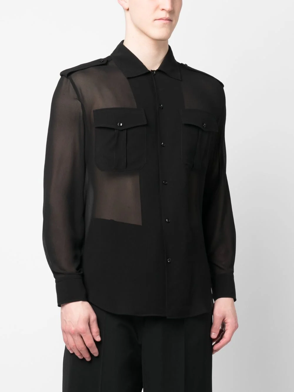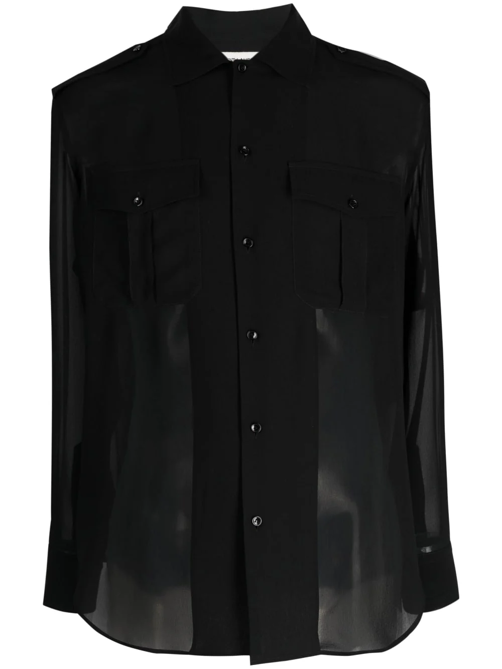Chemise en soie transparente à manches longues de SAINT LAURENT avec col noir, soie, transparent, classique, fermeture à boutons avant, manches longues, poignets boutonnés et deux poches à rabat avant.