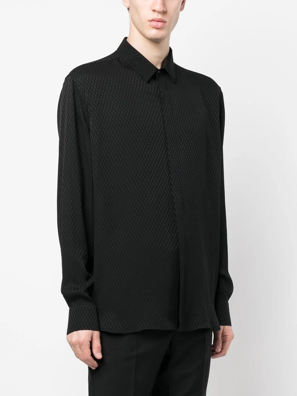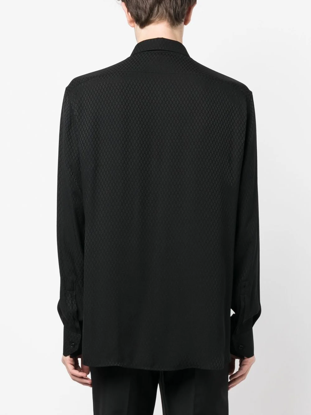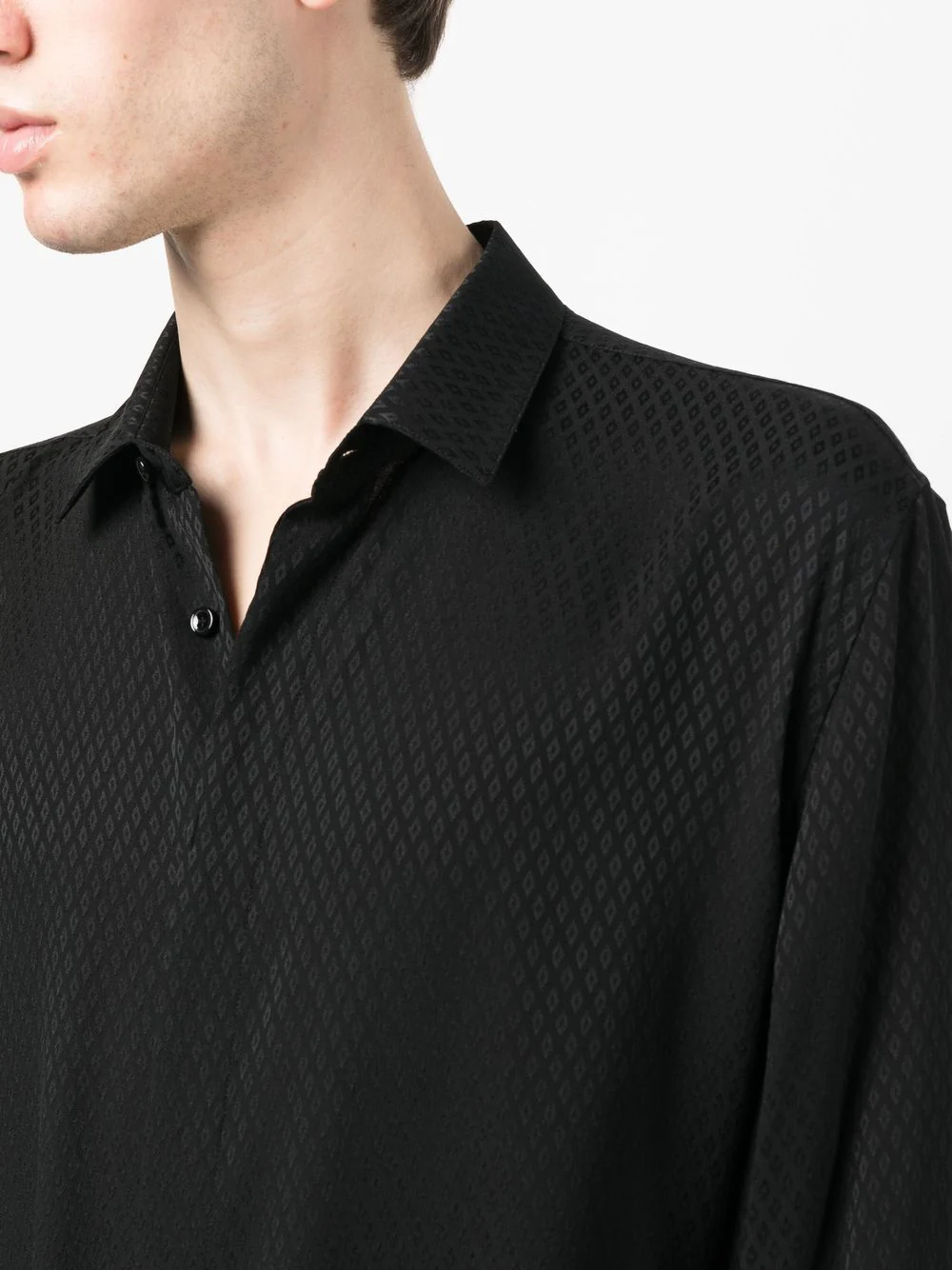 Noir, soie, jacquard, col classique, fermeture dissimulée sur le devant, poignets boutonnés.