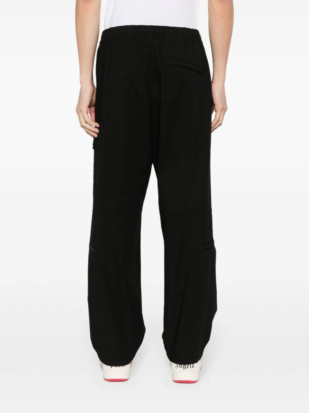 pantalon cargo à motif Compass signature noir coton mélangé texture tissu indéchirable teint après assemblage poches latérales fendues poche cargo latérale à rabat badge Compass signature détachable deux poches latérales zippées ourlet à lien de resserrage poche arrière à bouton pression QR code d’authenticité coupe ample taille élastique à lien de resserrage coton 95%, élasthanne […]
