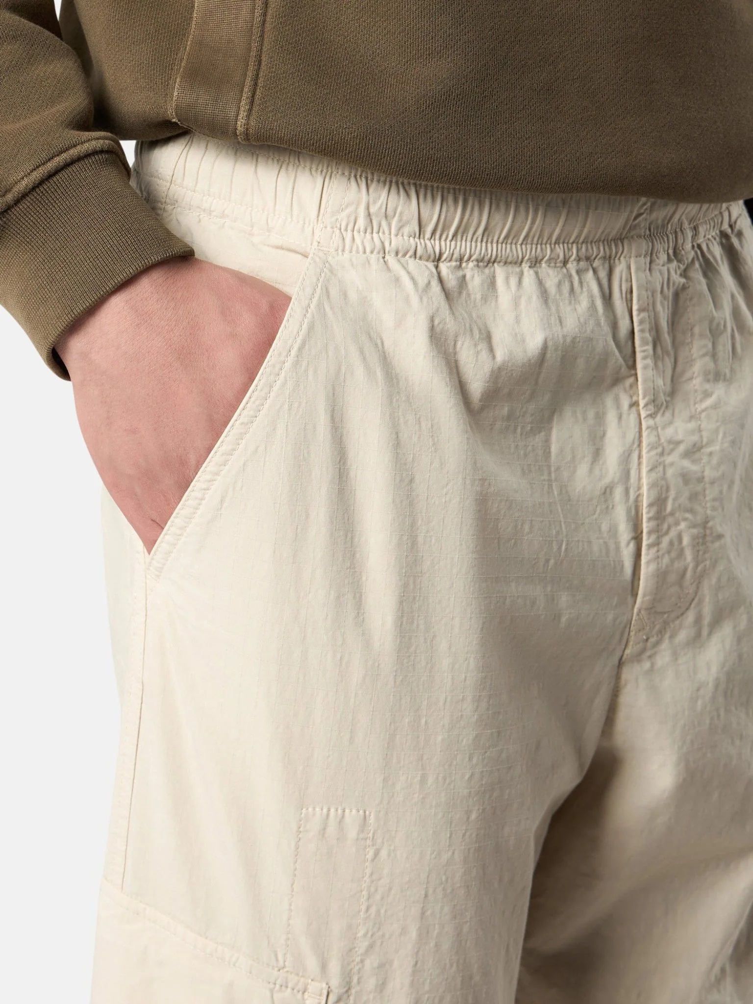 Pantalon cargo en ripstop de coton bio avec un composant extensible confortable, doté d’un cordon de serrage aux chevilles et d’une taille élastiquée. Modèle teint en pièce