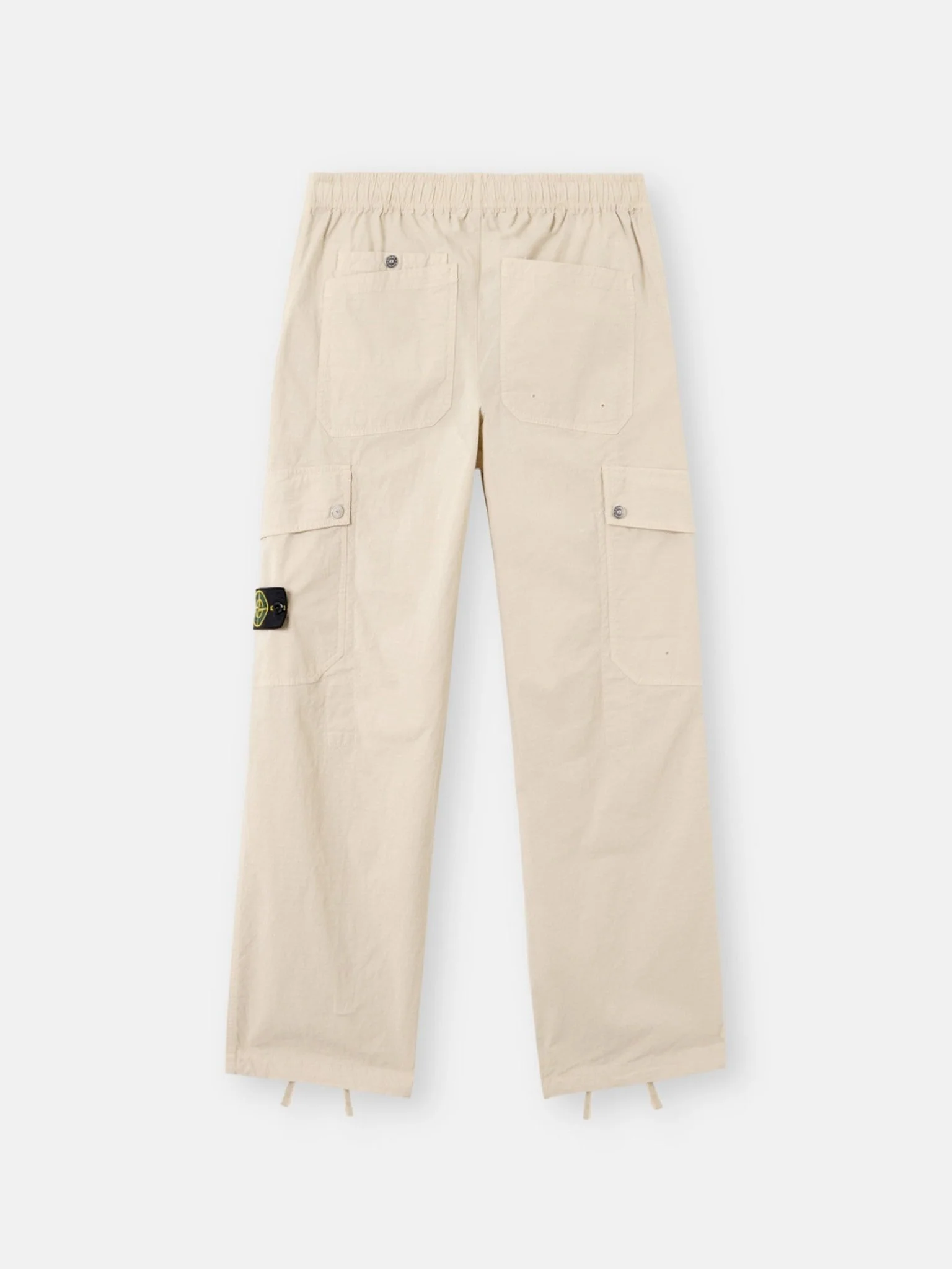 Poches mains en biais. Au dos, poche plaquée sur le côté droit ; sur le côté gauche, double poche plaquée à fermeture pressionnée. Poche plaquée à rabat sur le côté gauche et badge Stone Island fixé par bouton-pression. Cordon de serrage aux chevilles. Taille élastiquée à cordon de serrage intérieur. Braguette zippée. Coupe ample.