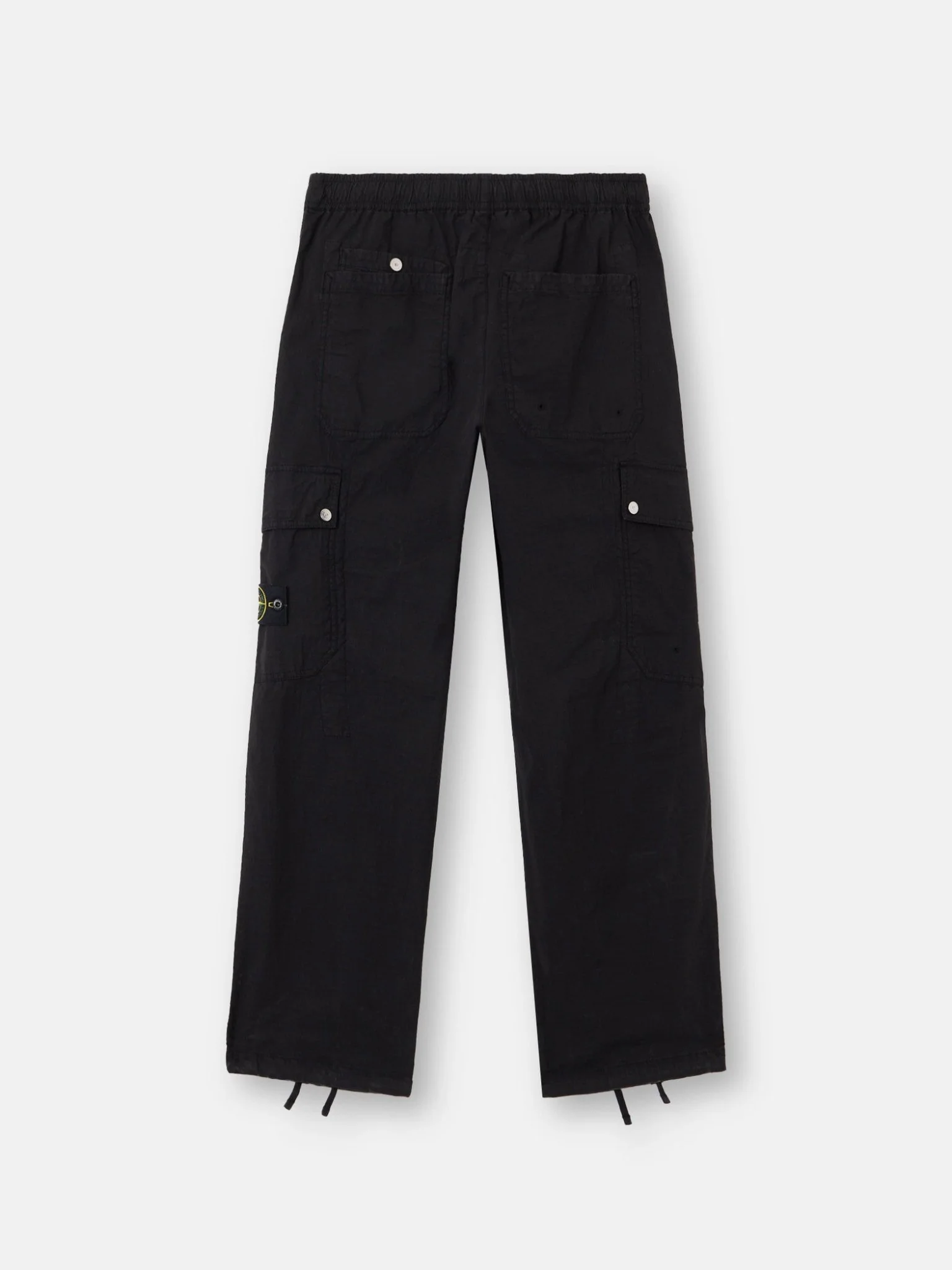 Poches mains en biais. Au dos, poche plaquée sur le côté droit ; sur le côté gauche, double poche plaquée à fermeture pressionnée. Poche plaquée à rabat sur le côté gauche et badge Stone Island fixé par bouton-pression. Cordon de serrage aux chevilles. Taille élastiquée à cordon de serrage intérieur. Braguette zippée. Coupe ample.