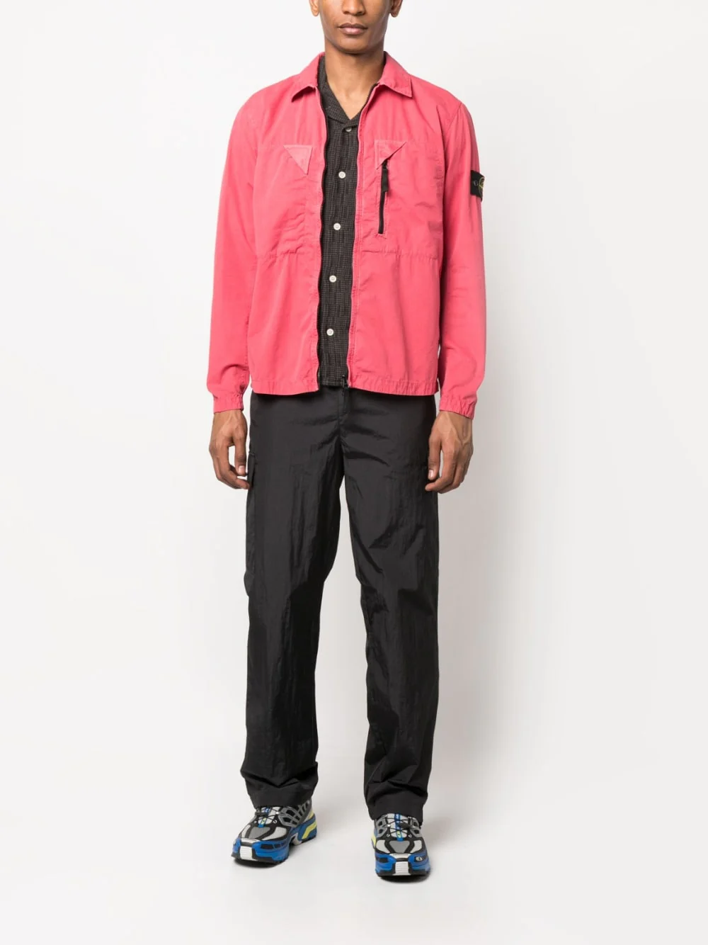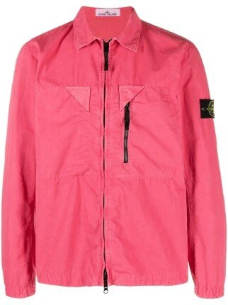 Deux poches poitrine, bordées de surpiqûres, avec fermeture zippée verticale ; ruban triangulaire pour dissimuler la tirette. Badge Stone Island sur la manche gauche. Boutons-pression au niveau des poignets. Fermeture zippée à double curseur.