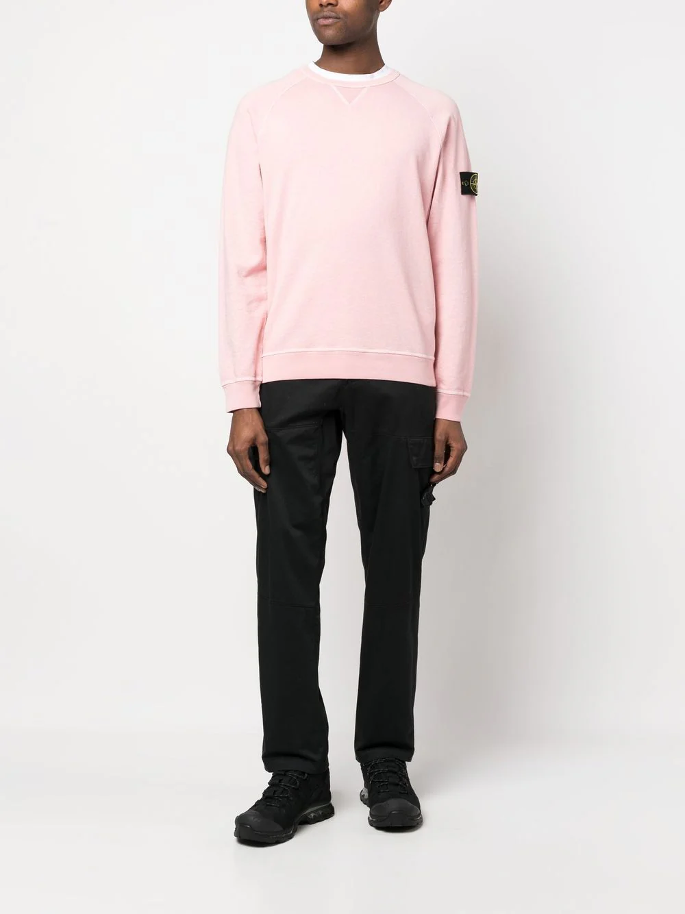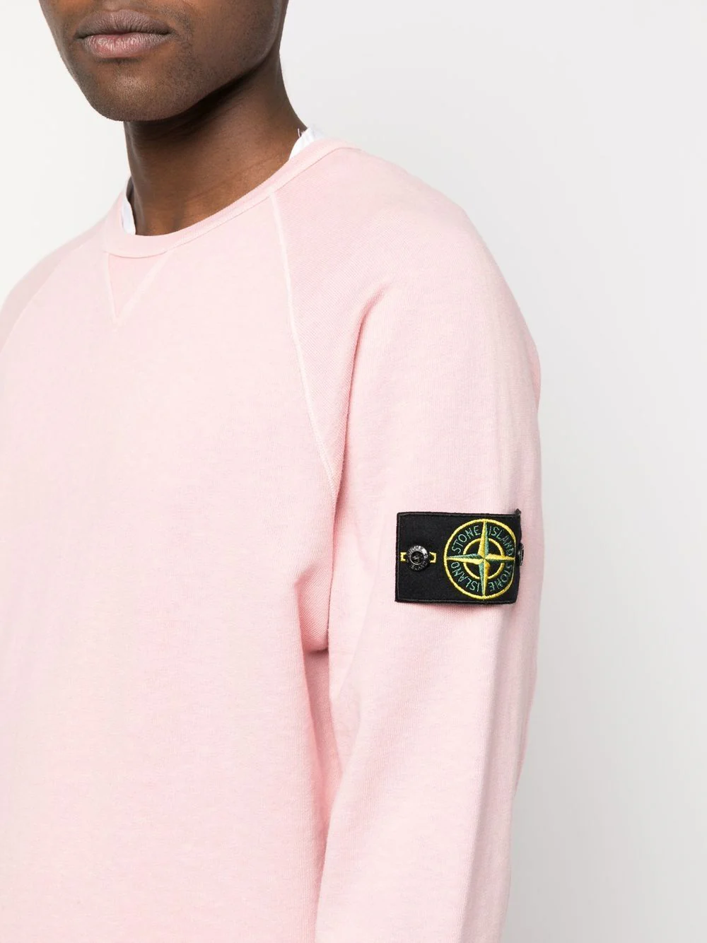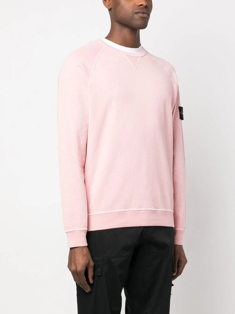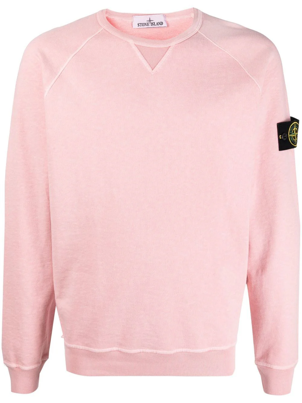 Encolure côtelée avec petit empiècement triangulaire. Manches raglan. Badge Stone Island sur la manche gauche. Poignets et ourlet côtelés.