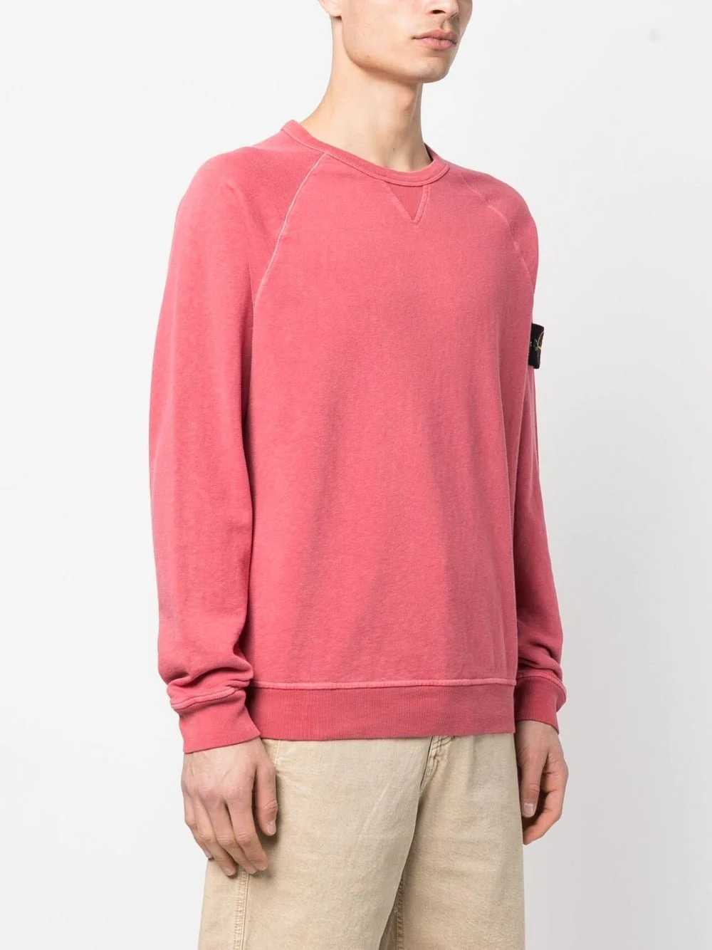 Encolure côtelée avec petit empiècement triangulaire. Manches raglan. Badge Stone Island sur la manche gauche. Poignets et ourlet côtelés.