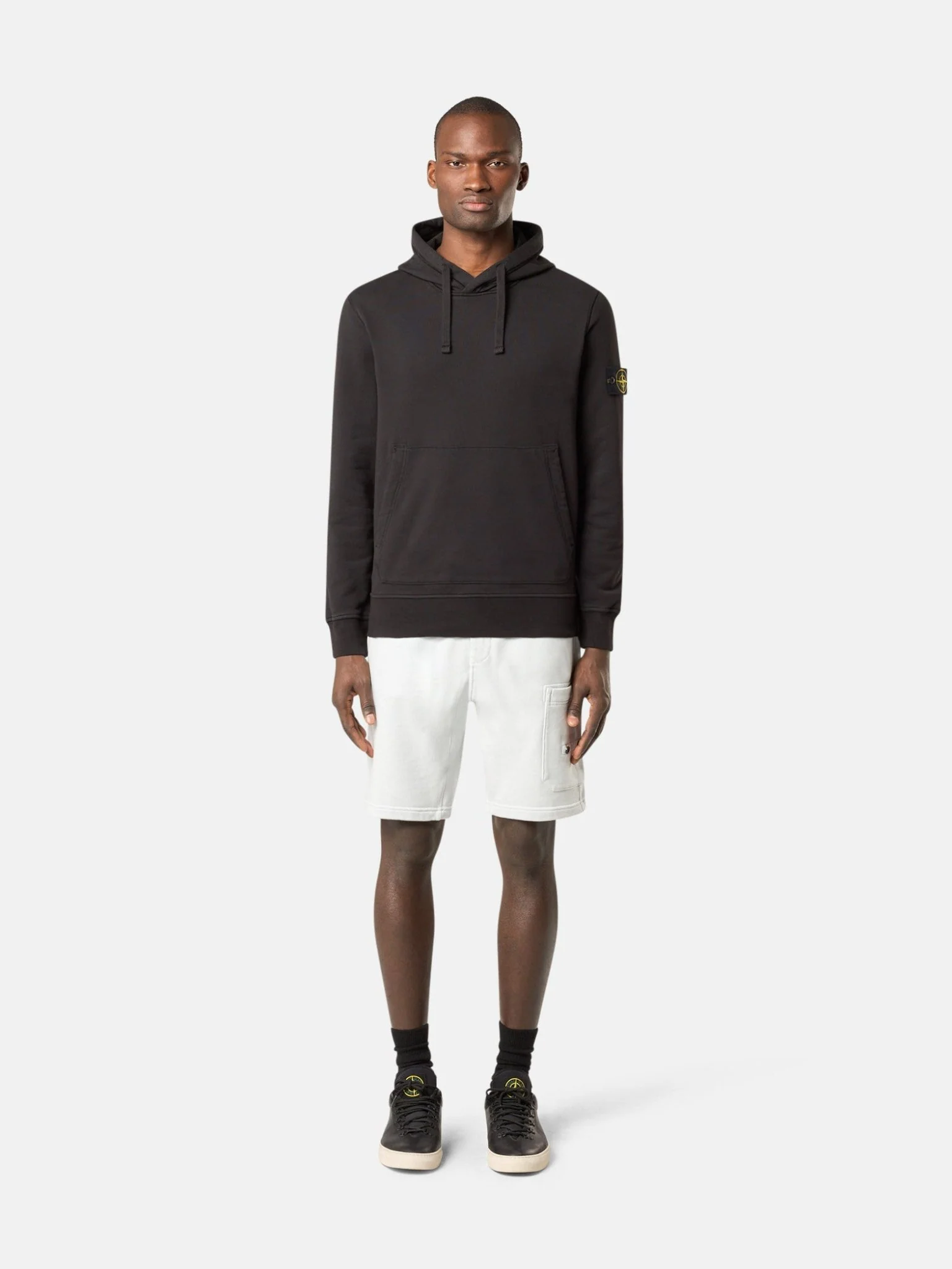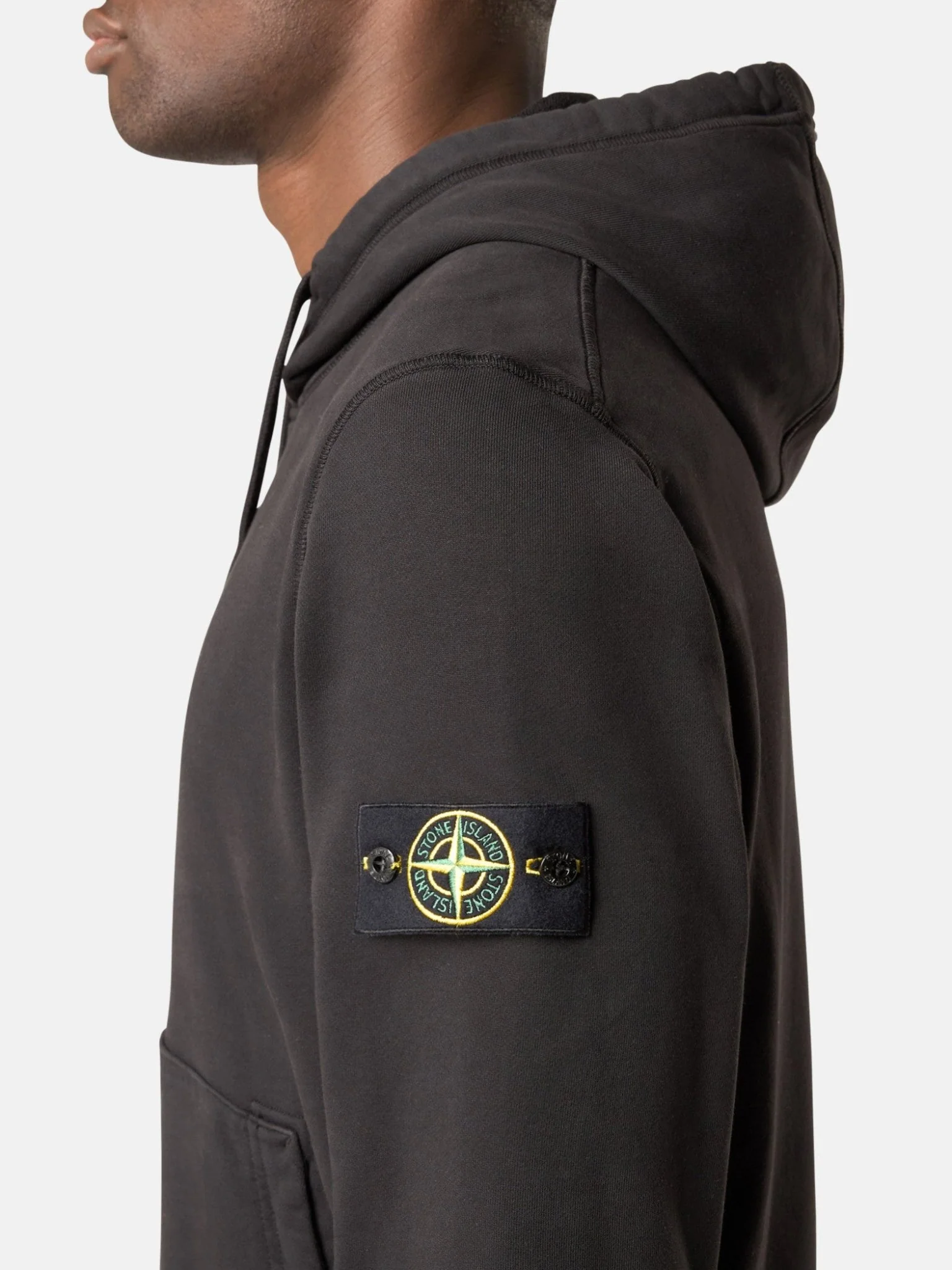 Capuche à cordon de serrage. Poches plaquées en biais. Badge Stone Island sur la manche gauche. Coutures surjetées. Lunette avec doublure intérieure sous l’encolure arrière. Poignets et bord inférieur côtelés. Coupe regular