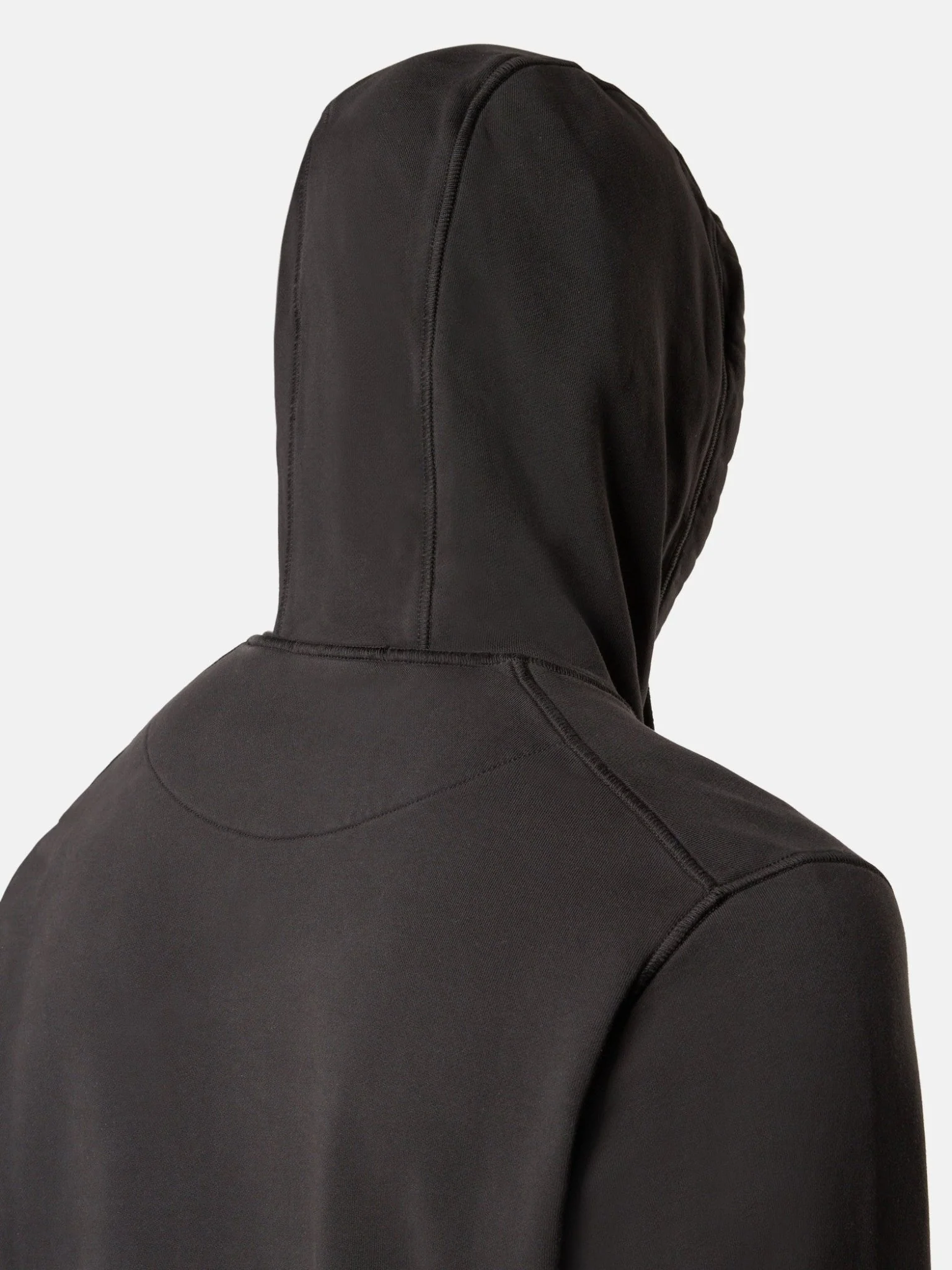 Sweat-shirt en molleton de coton biologique avec capuche à cordon de serrage, poches plaquées, coutures surjetées et détail de lunette sous l’encolure arrière. Modèle teint en pièce