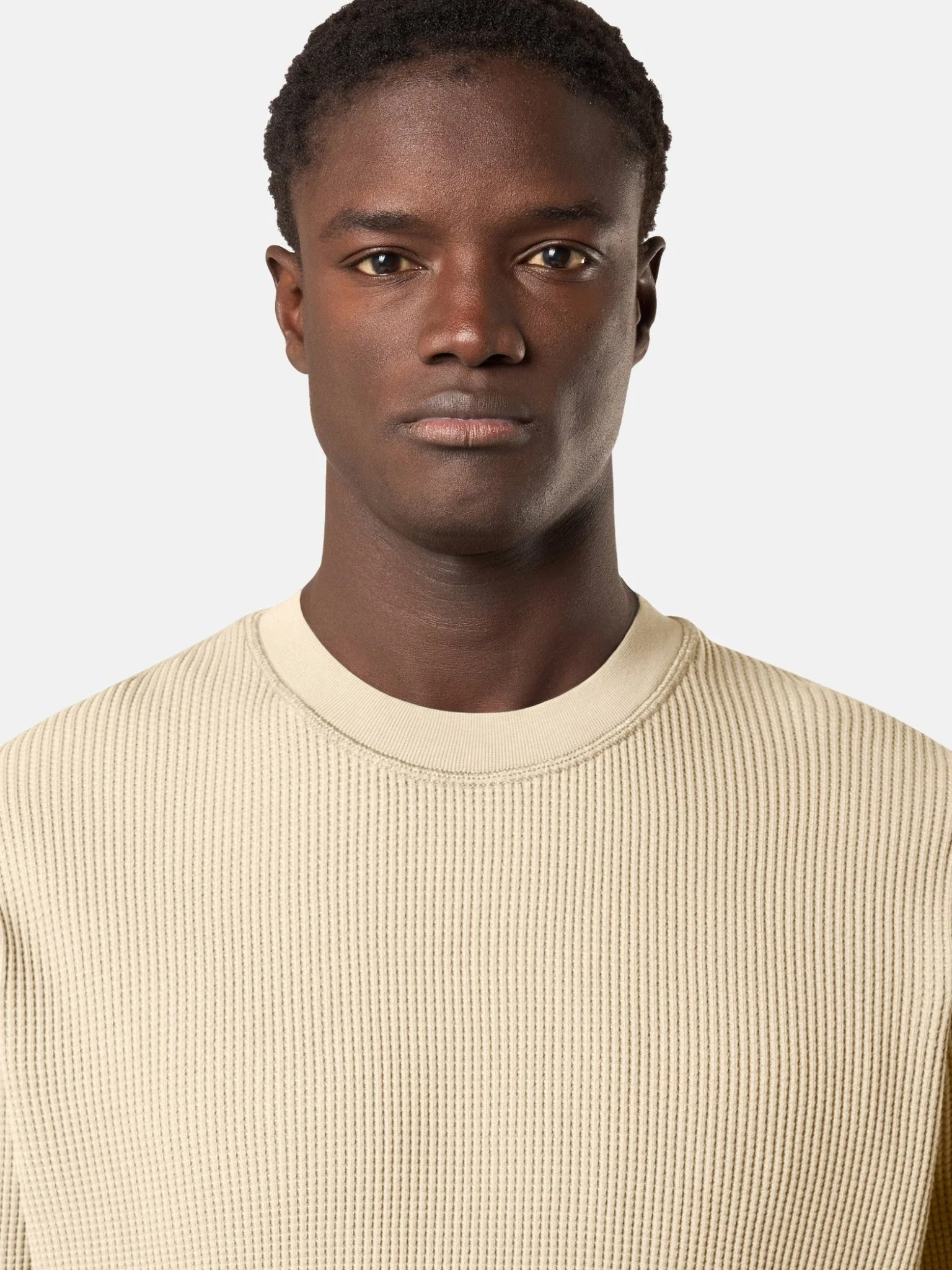 Sweat-shirt ras-du-cou en molleton gaufré de coton biologique avec coutures surjetées et détails d’intarsia côtelés sur les côtés et sous les manches