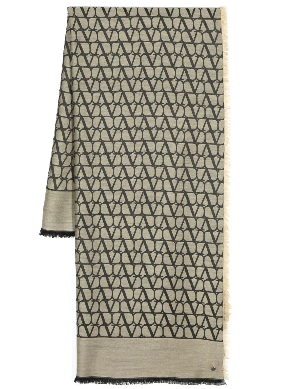 Beige, noir, laine vierge et soie mélangées, motif monogrammé en jacquard, bords frangés.