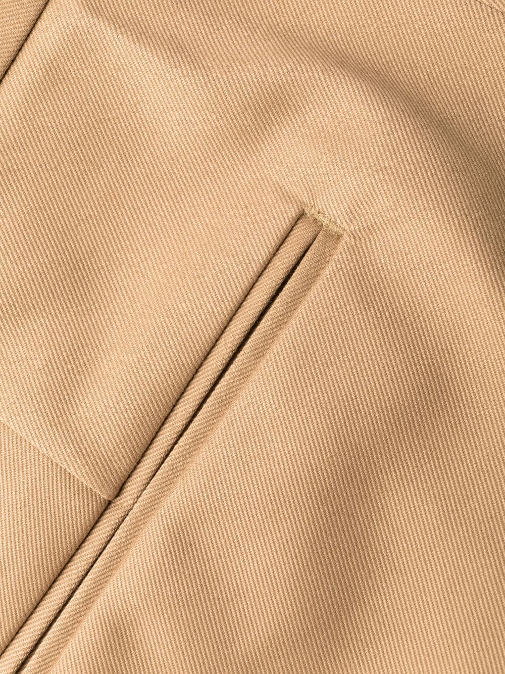 Beige, coton stretch, plis marqués, fermeture dissimulée sur le devant, coupe slim, deux poches latérales fendues, poches arrière passepoilées.