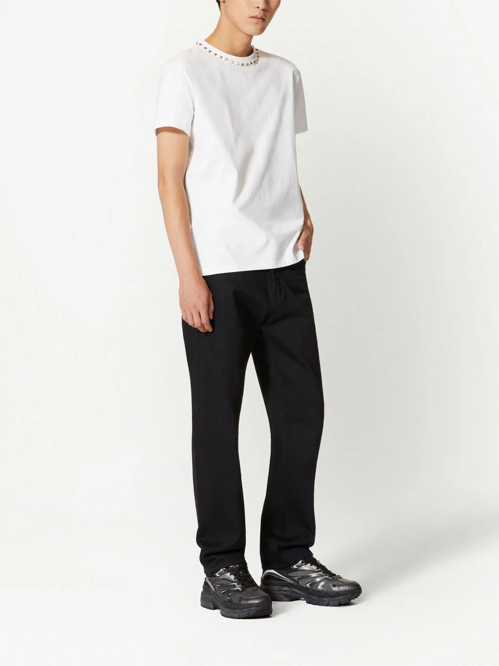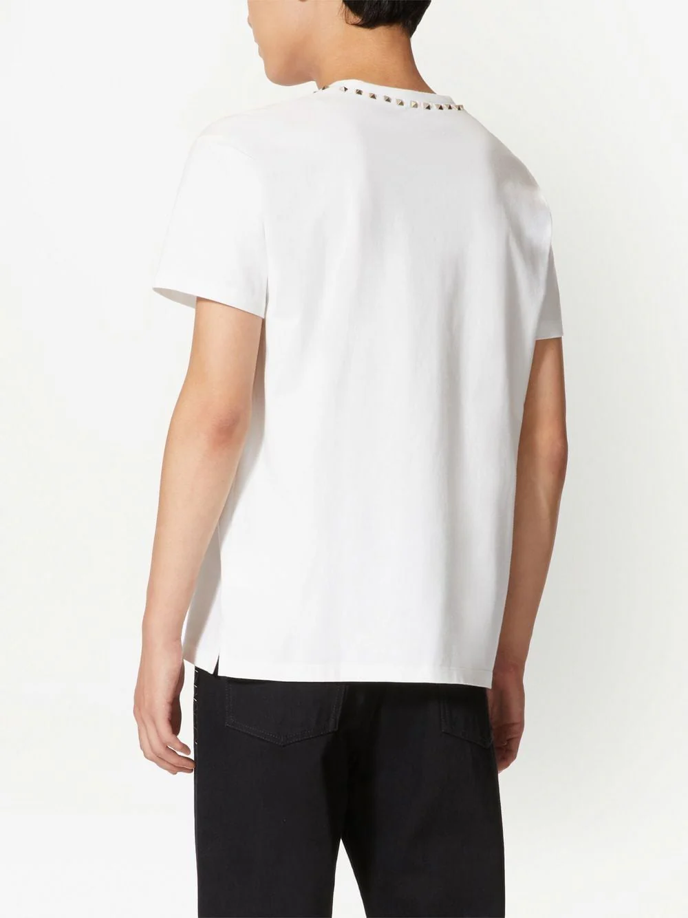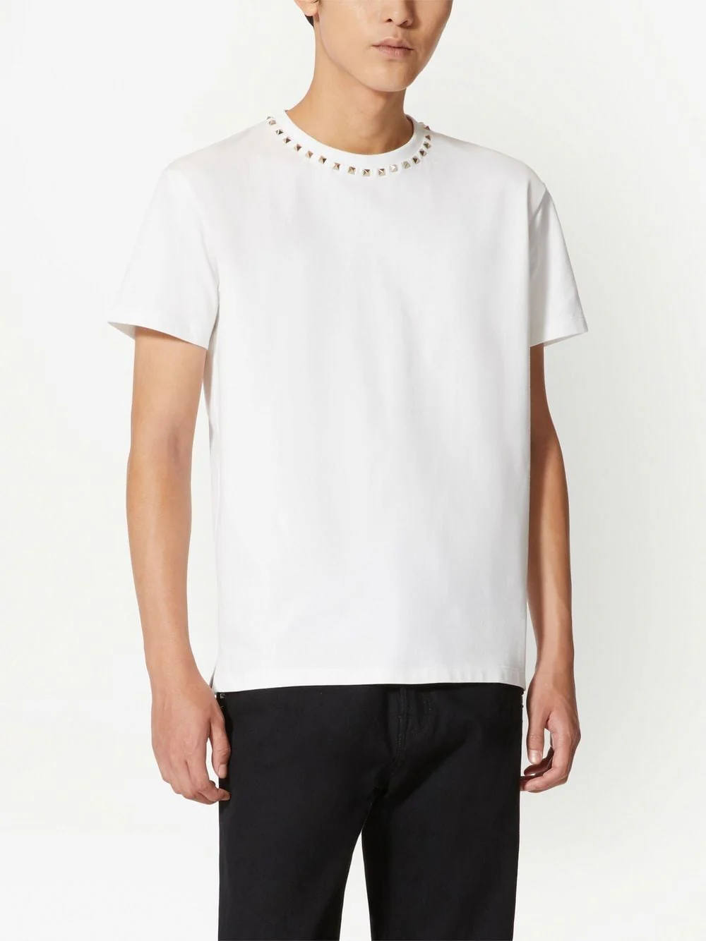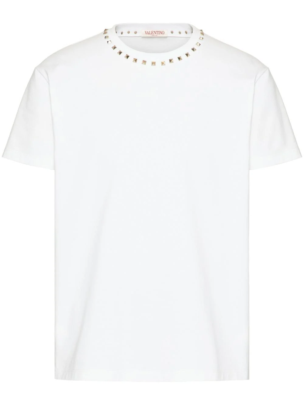 Blanc, coton, détails de clous Rockstud signature, tricot point jersey, encolure ras du cou, manches courtes.